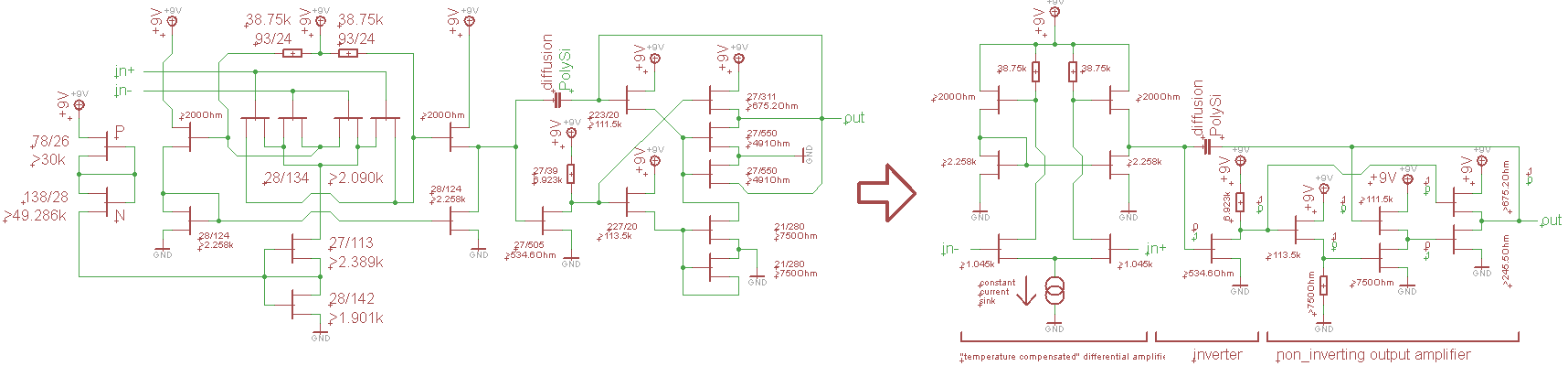 In the differential amplifier sensing +in and -in, we have 4 FETs instead of two.