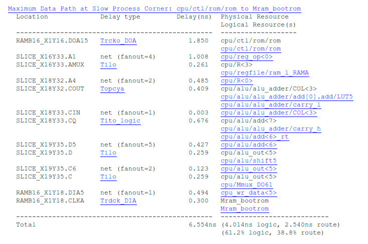 Longest path in nearly all cases is microcode ROM->register file->ALU adder->ALU shifter->DB out mux->RAM. Nothing fancy, really, and nothing that suggests any possible improvement. In earlier timing runs that I did, the output mux may have been optimized away, so I got some slightly better results.