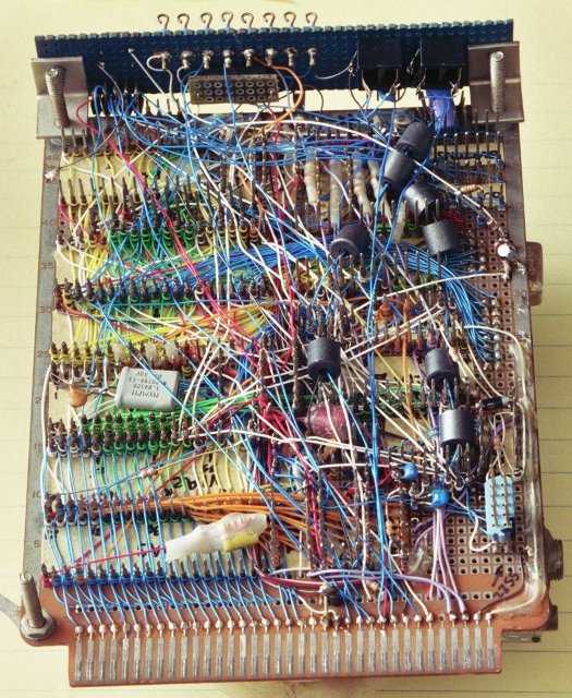 The one we're talking about would need longer connectors to leave more room between boards for the home-made wire-wrapped boards. Anyway, the method is used in place of a backplane.