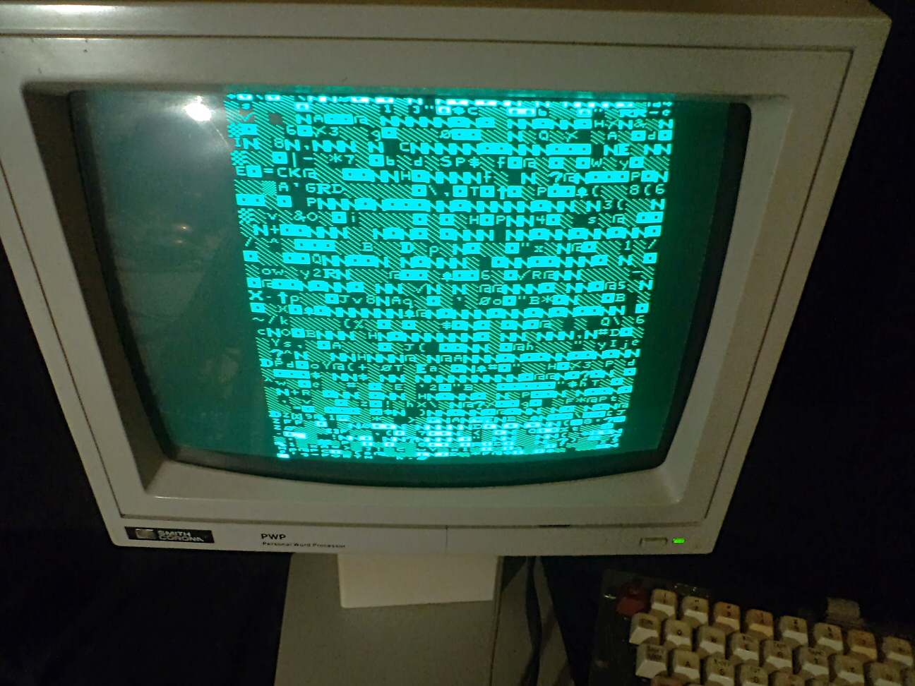 Here's the video display, showing mostly just power-up garbage in RAM. The video format is extremely flexible, but defaults to 16 kilohertz scanning suitable for re-purposed NTSC televisions. That limits us to 32 characters per line -- which I found to be adequate or even preferable when the material viewed is Forth source code!