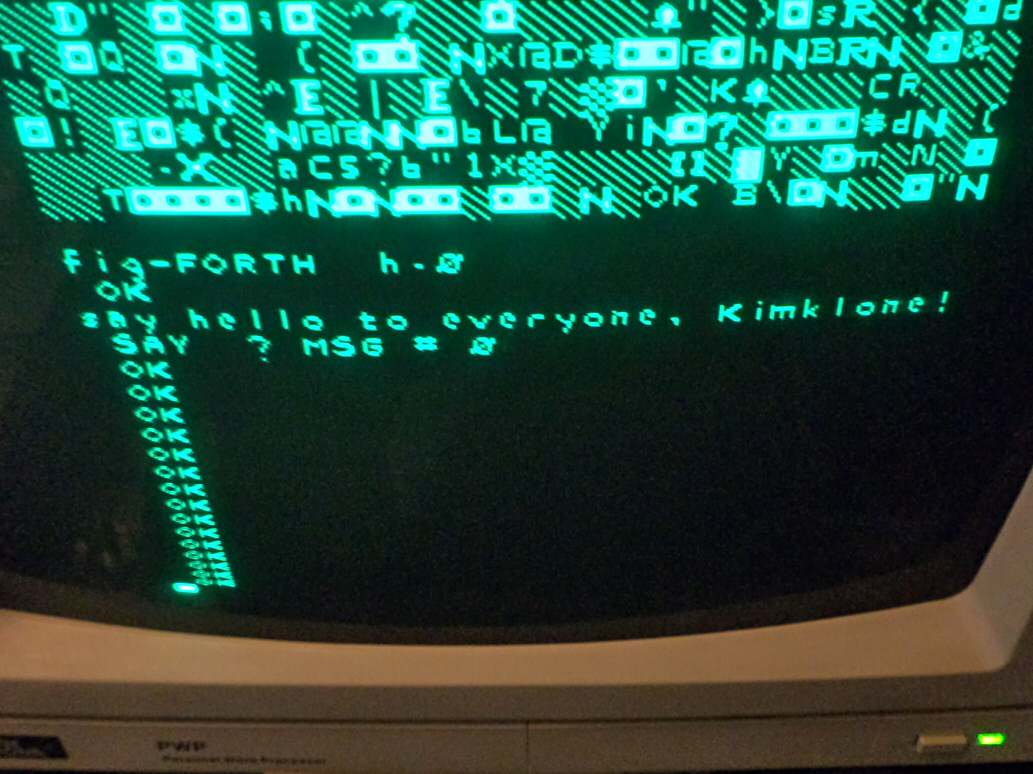 This last shot is just silliness, hamming it up for the camera. After the Fig-Forth greeting and OK prompt, you can see I've entered a text string in English -- not Forth.