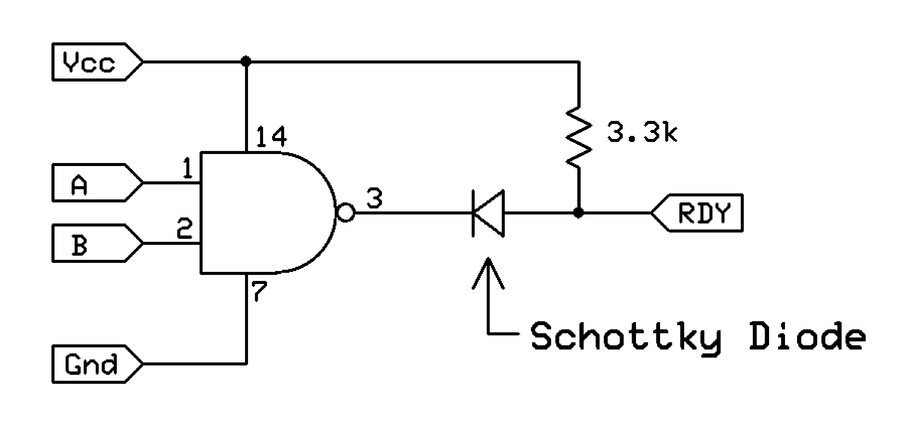 But then does that arrangement allow external devices to control RDY? Is it that when the cathode of the diode is at low voltage, most voltage will be lost through the pullup, and when the cathode of the diode is at high voltage, little current flows from anode to cathode and the resistor pulls up the voltage at RDY to logic high?