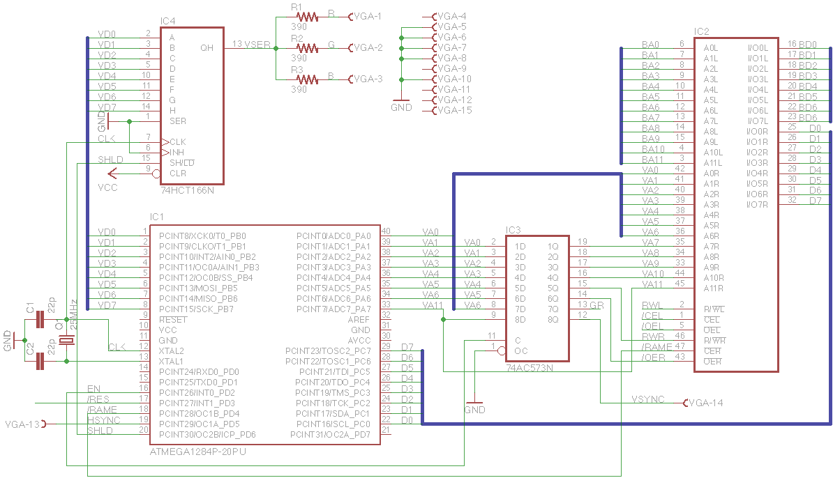 I'm currently using something like this this only shows the video side. The CPU just connects to the "left" side of the dual-port RAM. Any CPU can be used as long as the 55ns access time of the RAM is sufficient. The dual-port RAM provides the Frame Buffer, currently the program in the AVR converts the frame-buffer content to a 24x80 B/W text display. Also the AVR can write to the frame buffer so I can use the dual-port RAM as ROM emulator to bring up a system. The VGA signal is a standard 640*480@60Hz signal. Instead of a 74HC166 you could also use a 3:3:2 R-2R Ladder to create 256 colours.