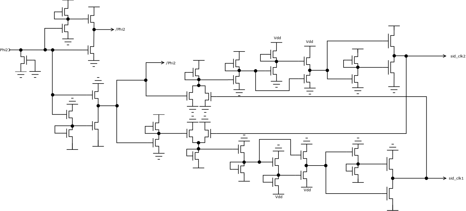There are two symmetrical parts that produce two signals used to clock the digital logic of the chip, sid_clk2 which is high when phi2 is high and sid_clk1 which is high when phi2 is low. There are also some timing effects involved, as bigger transistors have longer switching times, but I don't think these are critical for the analysis so I won't get a headache over this for now. The one thing that instead puzzles me is why there are two inverters powered with Vdd at 12V while the remaining are connected to Vcc at 5V... :?