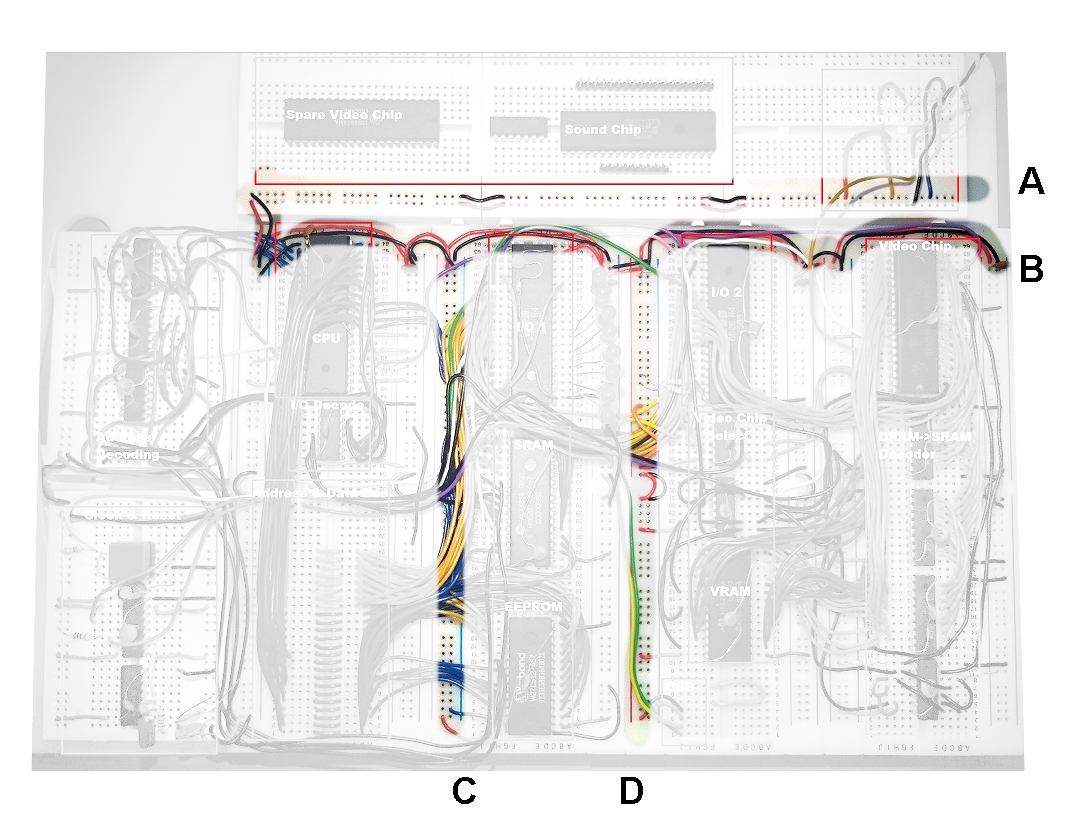 Alright, I found a photo... perhaps no longer up-to-date, but it'll serve. I see you have bypass capacitors connected directly to the chips -- which is good -- but instead I wanna talk about the connections between chips. I'll start with the data-bus connections between the RAM (which is at issue in this thread) and the CPU.