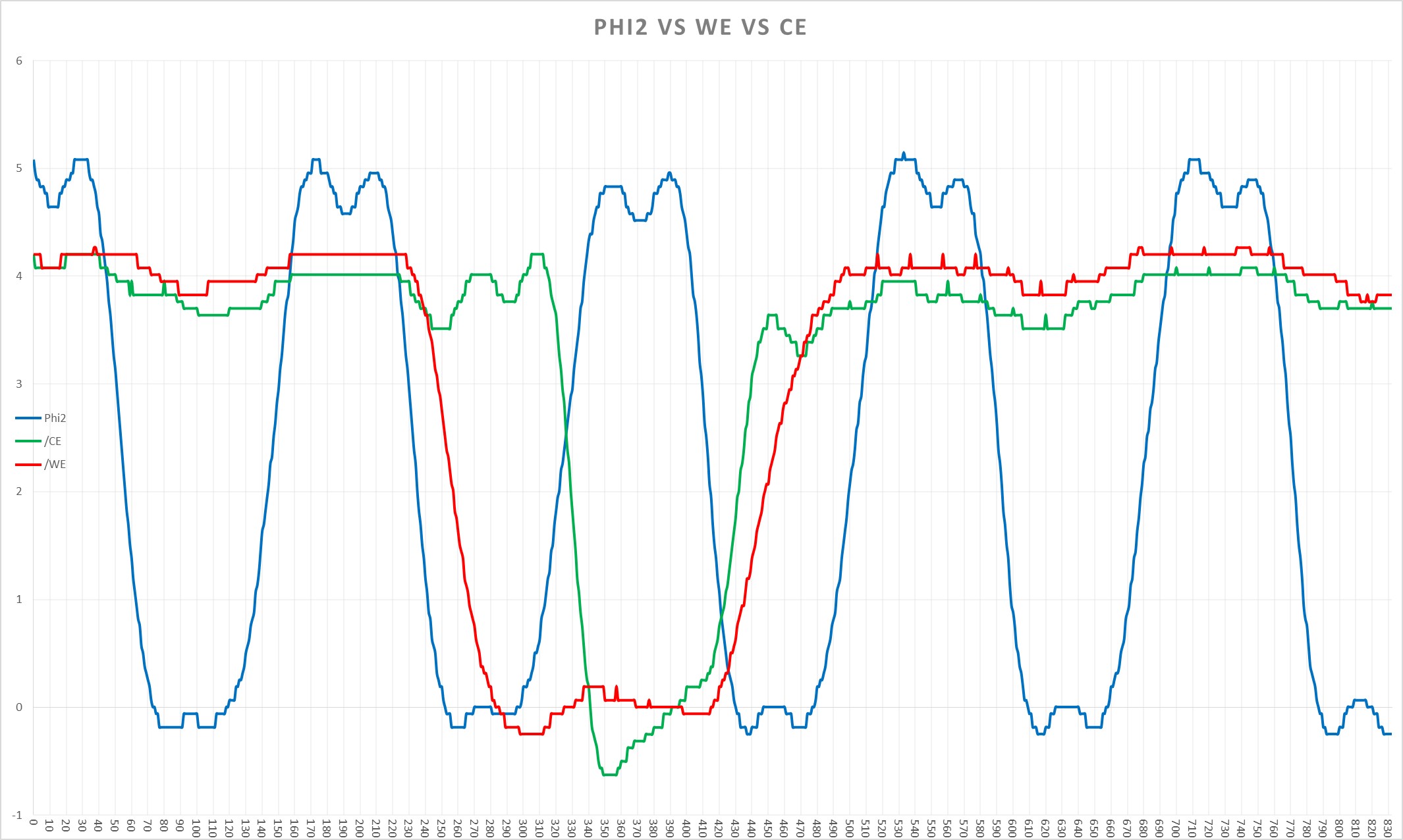 So I did a data dump out of my PC scope of Phi2 vs /CE and Phi2 vs /WE in to Excel, then aligned the time axis to show a graph of Phi2 vs /CE vs /WE. Hopefully you can see the jpeg.