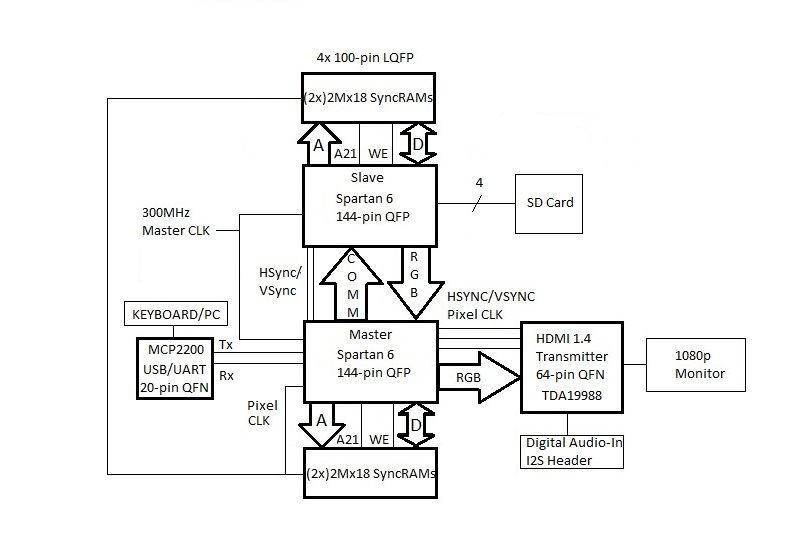 Oh damn, you're good! Yes, that particular USB I/F for the keyboard will most likely be attached to the bottom Master Spartan 6. If I run out of pins on the Master Spartan 6, then I don't think it would be a problem dumping hi-speed data into one of the RAMs controlled by the slave Spartan 6 using another USB hi speed contoller.