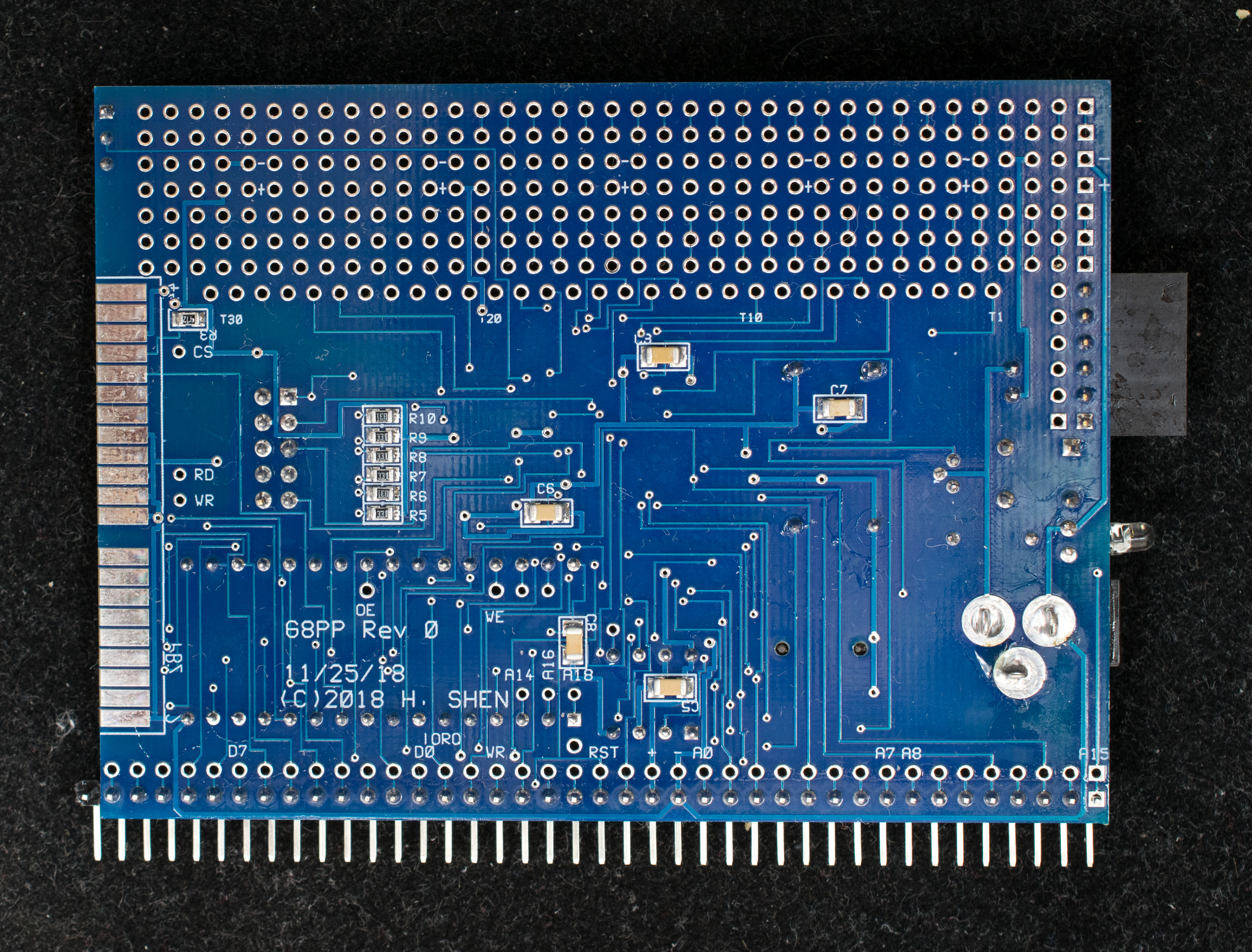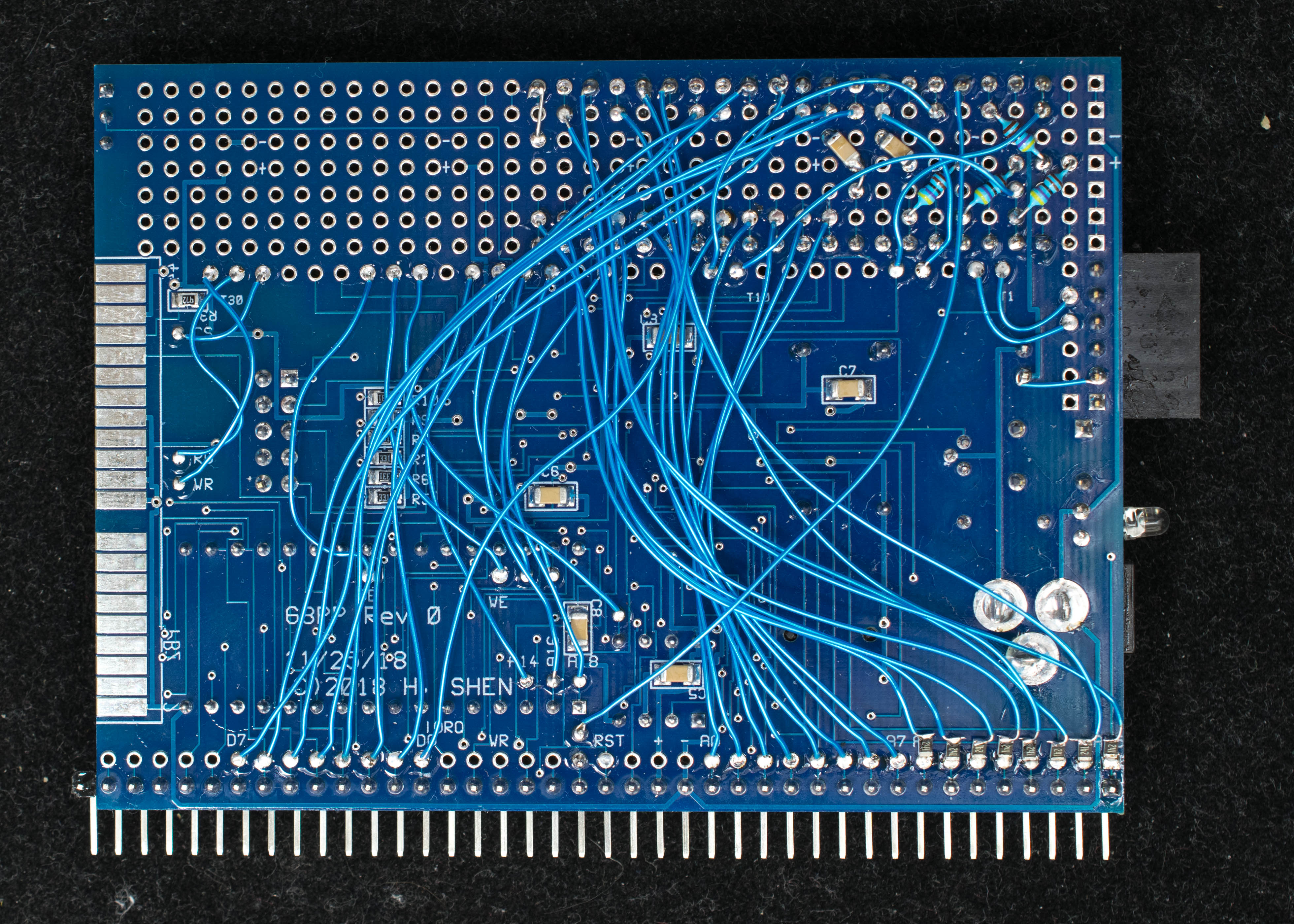 This is the G8PP+6502 as of a couple hours ago. The series resistors on address lines are not yet added in the photo. Clock is 7.37MHz. Signals look reasonably clean on the scope. I think I'm loading serial data into RAM and observing it bootstrapping after 255 bytes, but it is not executing correctly. There are many moving pieces to this puzzle, one of them is that I don't know much about 6502 assembly instructions. Climbing a steep hill but having fun!