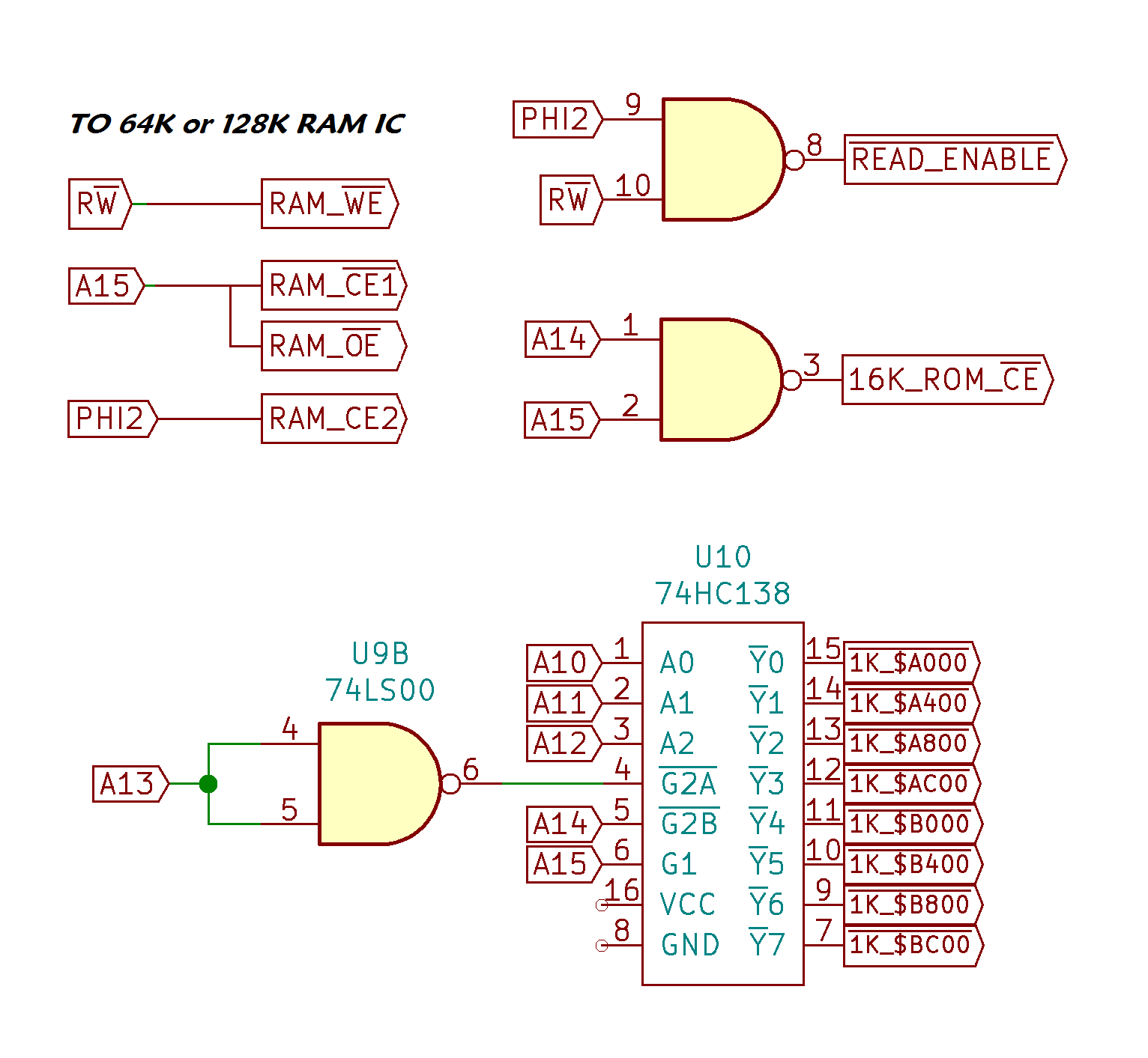 Earlier I mentioned using a 64K or 128K RAM IC which might eliminate one IC in your decoder logic. Not sure you need to qualify the ROM read_enable signal with PHI2...