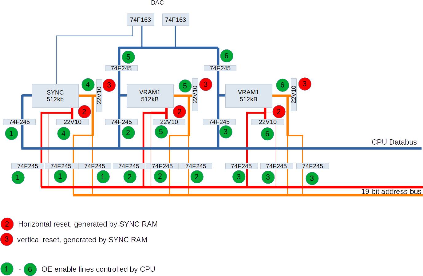I have 3 static RAMs. One holds sync information, the other two 6bit video signals (2 bit for each color). Each RAM can either be addressed by a counter, or by the 19 bit address bus. X and Y counters are created by 22V10 (10 bit counter each). I decided to give each of the 3 RAMS its own counter pair rather then routing the signals and separating them via 245 chips. The address bus is separated from the RAMs by three 74F245 (or 74HC245) chips. The counters have separate output enable controls.