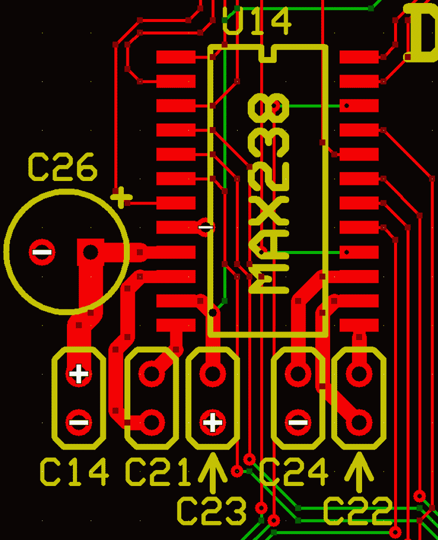 Four of the capacitors are part of the charge pump circuit, which takes the nominal 5 volt Vcc source and produces approximately +10 and -10 volts to drive the TIA-232 outputs. The fifth capacitor is just a usual bypass capacitor. All capacitors should be as physically close to the MAX238 as possible. If you are doing this on a PCB you can place the four charge pump caps (C21-C24 in the attached illustration—C14 is the bypass cap) at the "south" end of the MAX238, which will make for short traces. The MAX238s (two of them) in POC V1.2 are in SOIC-24 packages, which don't take up a lot of space and may be manually soldered—at least by someone with vision in both eyes.