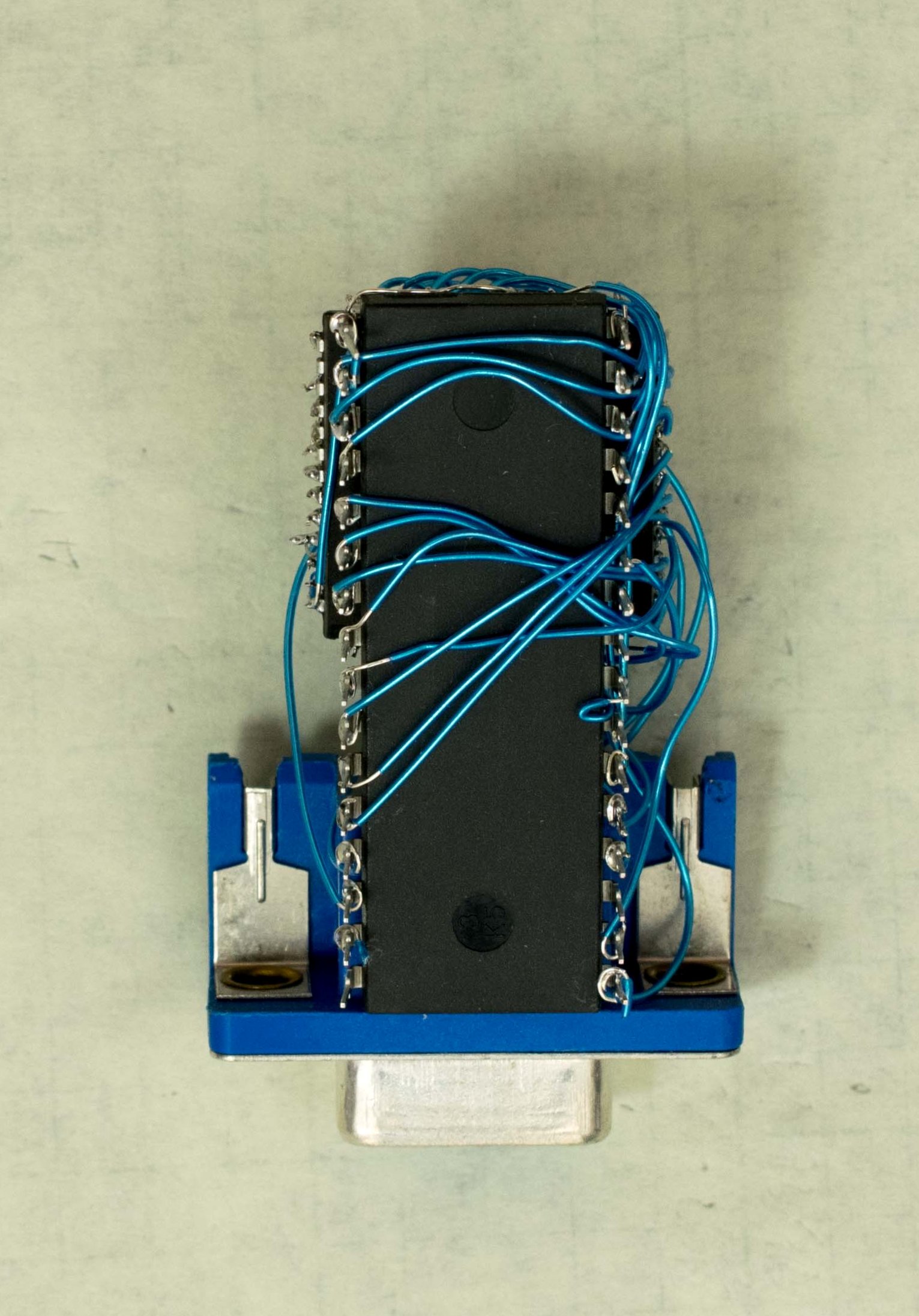 This is a follow up to my musing about using system RAM socket as a VGA interface. The 4K dual port video RAM is shadowing a 4K portion of the system RAM such that all write to the designated 4K portion of the RAM is also written to the dual port RAM. The VGA controller is reside on the CPLD which will display the content of the dual port RAM on a VGA monitor. The interesting part is the circuitry is implemented as collection of stacked ICs so CPLD, dual port RAM and 25.175MHz oscillator are all stacked on top of the system RAM. The first figure shows all the components of a stacked VGA interface. The 2nd picture shows the components of stacked VGA glued to the system RAM.