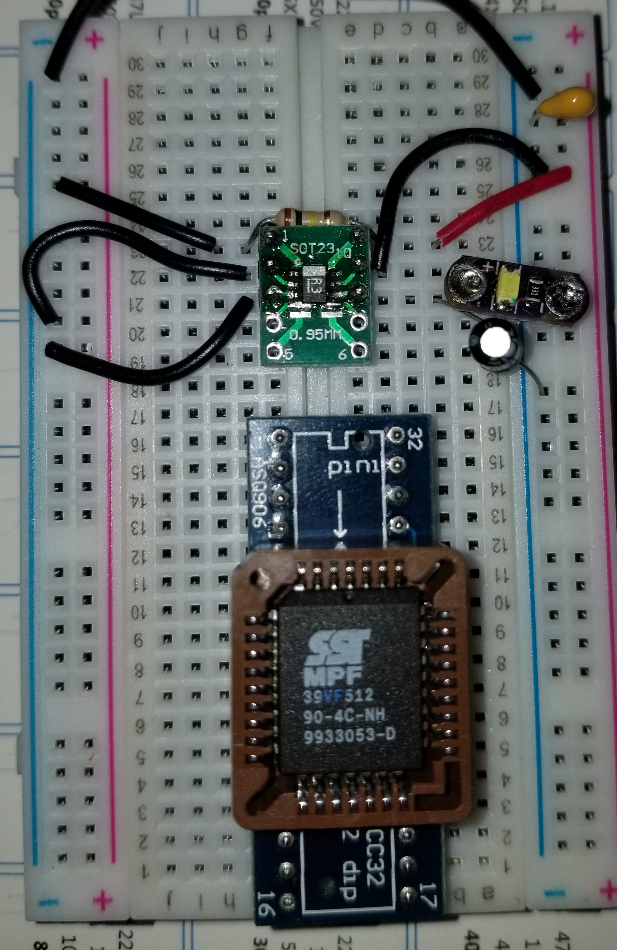 I pulled a SST 39VF512 90ns Flash ROM from an old NVIDIA graphics card and tested it out, works great! Whipped up a 3.3v circuit for it using a TOKO TK11432M regulator. Puts out a steady 3.21V. Haven't hooked it up yet but this should give me a slight edge over my AT28c256 and has more room for future projects. Now, with a 3.3v source I can easily implement any other 3.3v elements into my project if need be.