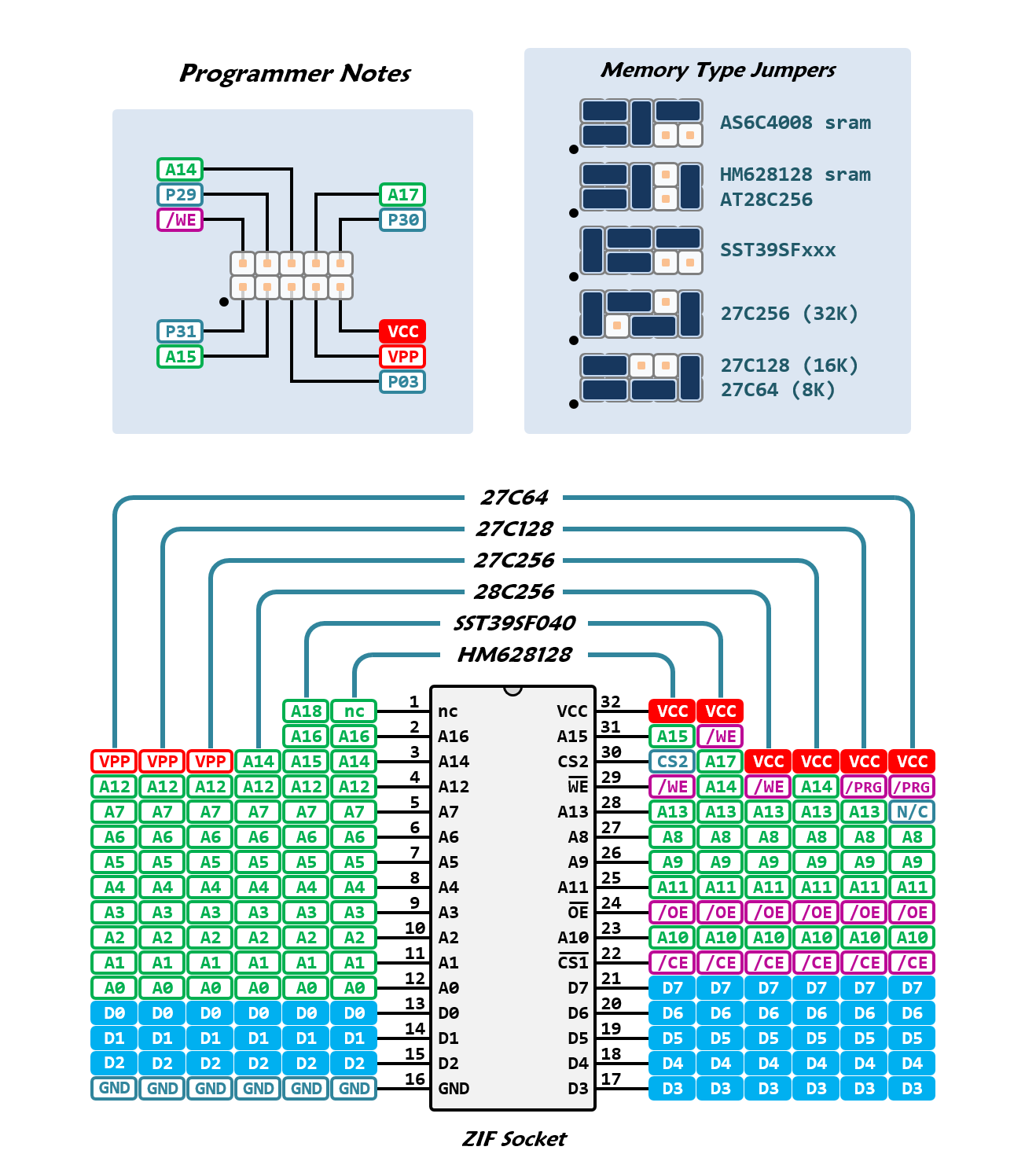 May I mention the SST 39SFxxx series Parallel FLASH ROMs in PDIP package as an alternative to the AT28C256 EEPROM? The 128-KiB 39SF010A is $1.47 at Mouser or $1.52 at Digikey while the AT28C256-15PU EEPROM is $10.75 at Mouser or $10.66 at Digikey (15-Aug-2021). Example (untested) designs below.
