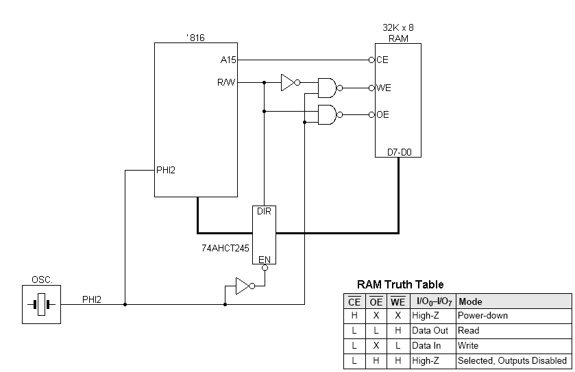 As noted earlier, there's more than one "right answer" to the question. Here again is the "classic" schematic -- the arrangement which uses a pair of NAND gates to generate qualified /Read and /Write signals from Phi2 and the CPU's R/W output. I added the Truth Table for typical RAMs.