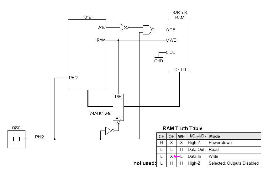 It may seem odd that /OE is grounded; however, in the Truth Table you'll see that the state of /OE doesn't matter (it's a "don't care") if /WE is low. /WE and /CE alone are sufficient to select the three modes we need: power-down, read and write.