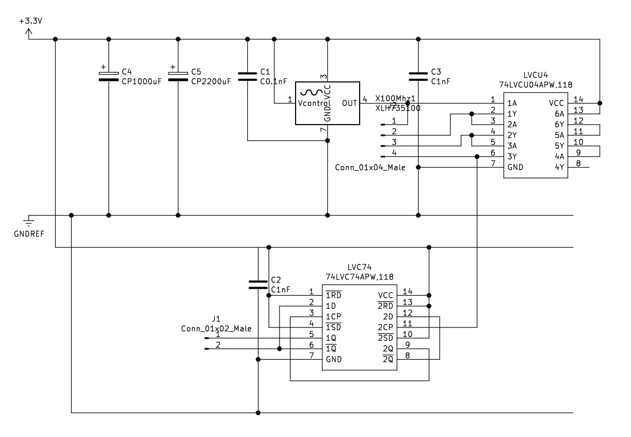 Basically I have 100Mhz clock oscillator connected to an unbuffered inverter and from there into a D-type flip flop all on soldered strip-board.