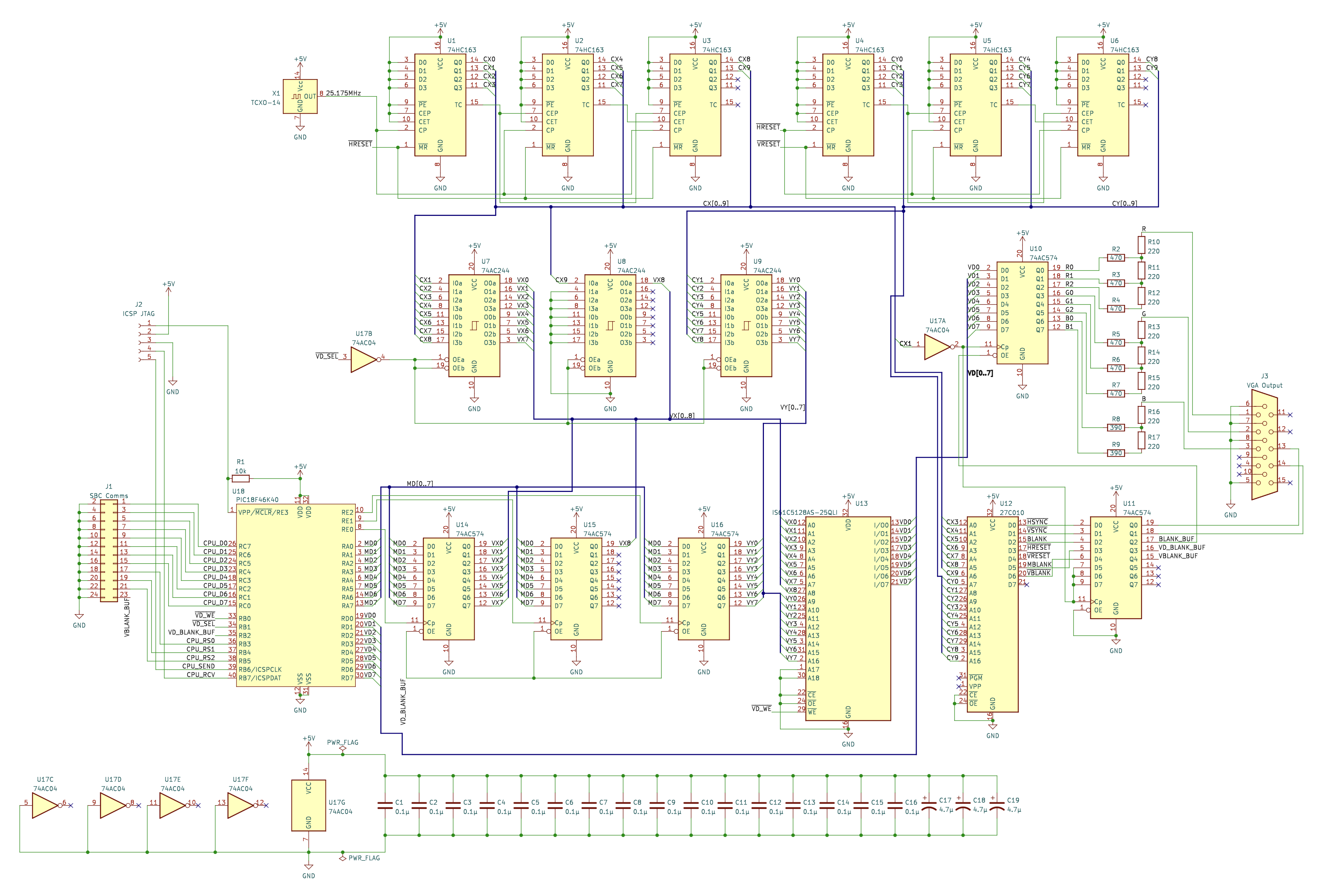 I have actually thought about this… I was thinking of adding a separate counter for the memory, which I think might also be used to prevent any memory from being used during the blanking interval (as I could just disable the counters when /BLANK is low). This opens up some interesting opportunities, because it would allow 320x200 to fit in a single 64kB chip. Have you tried anything similar? I worry about keeping the two counters properly synchronized.