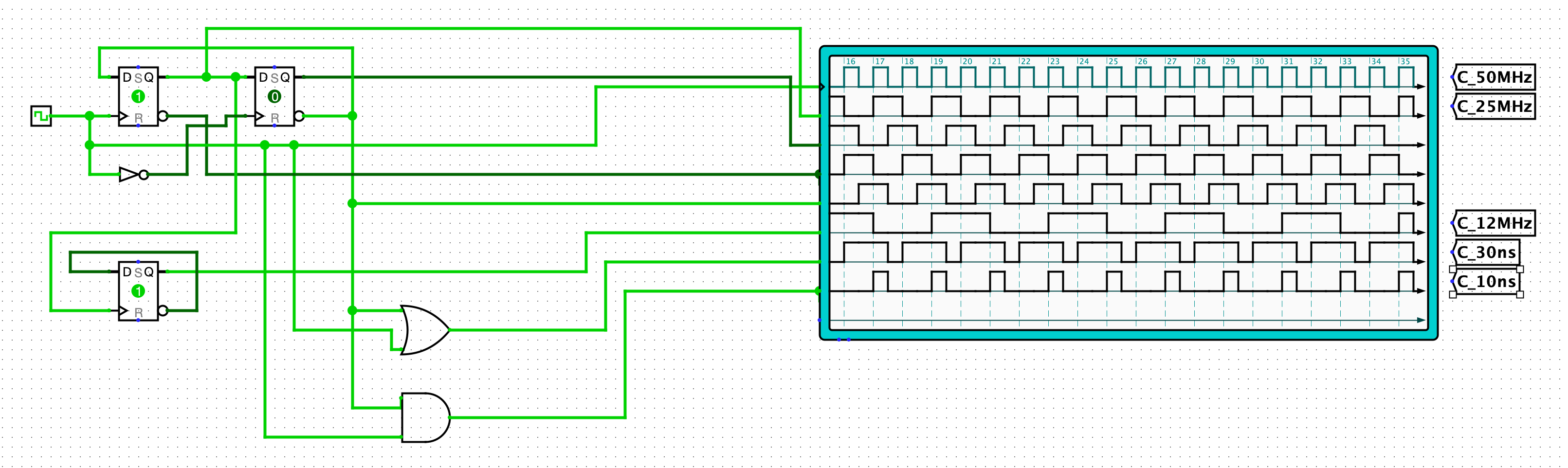 I think that's more or less what I've come up with above as well, though I suspect your approach is more elegant. The issue is that you have to start with 4x your target clock—or, at least, I can't figure out how to do it with a 2x clock speed, short of introducing artificial delays that aren't tied to the clock, which feels like would be too dependent on the vagaries of the individual components.