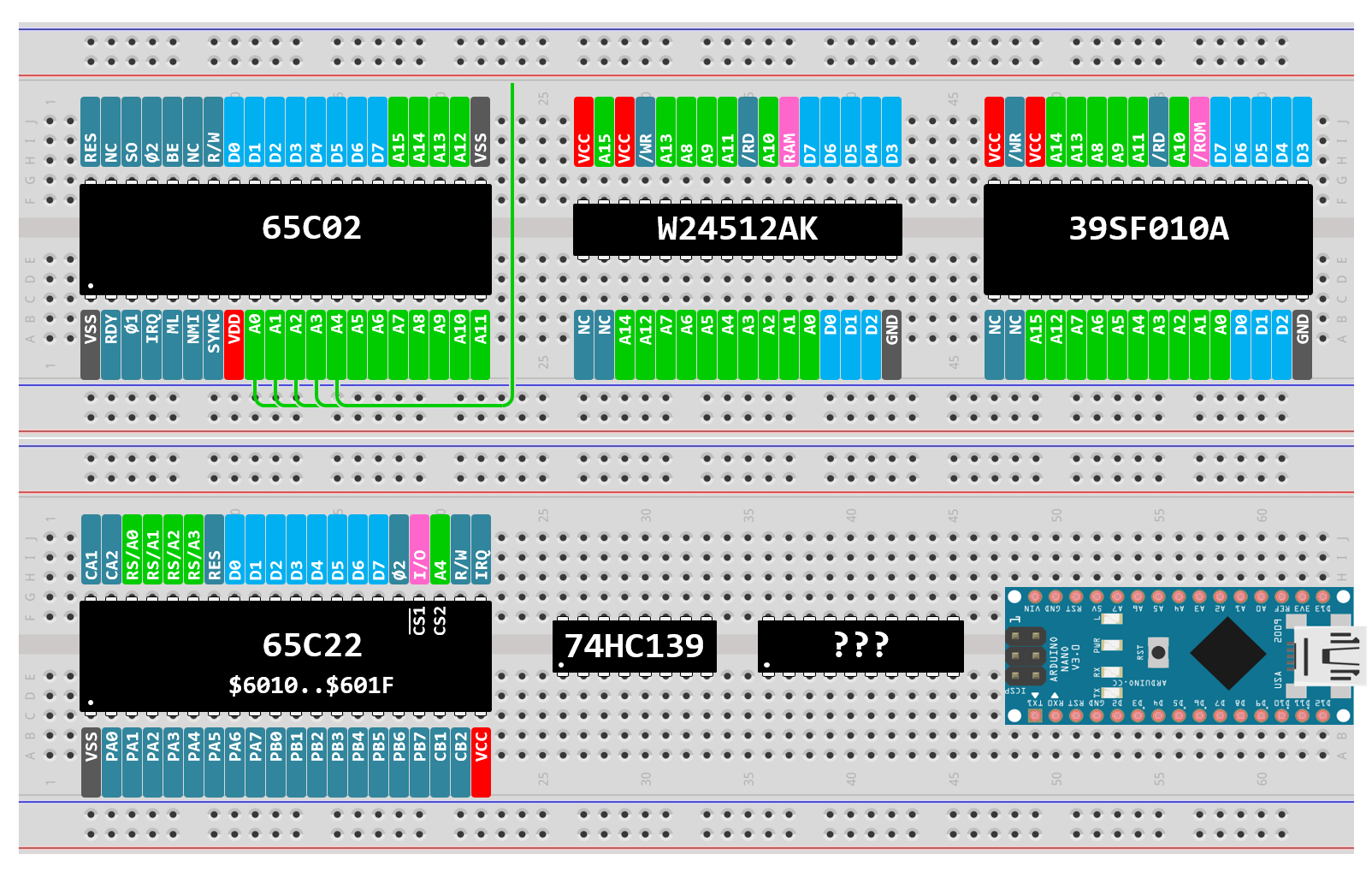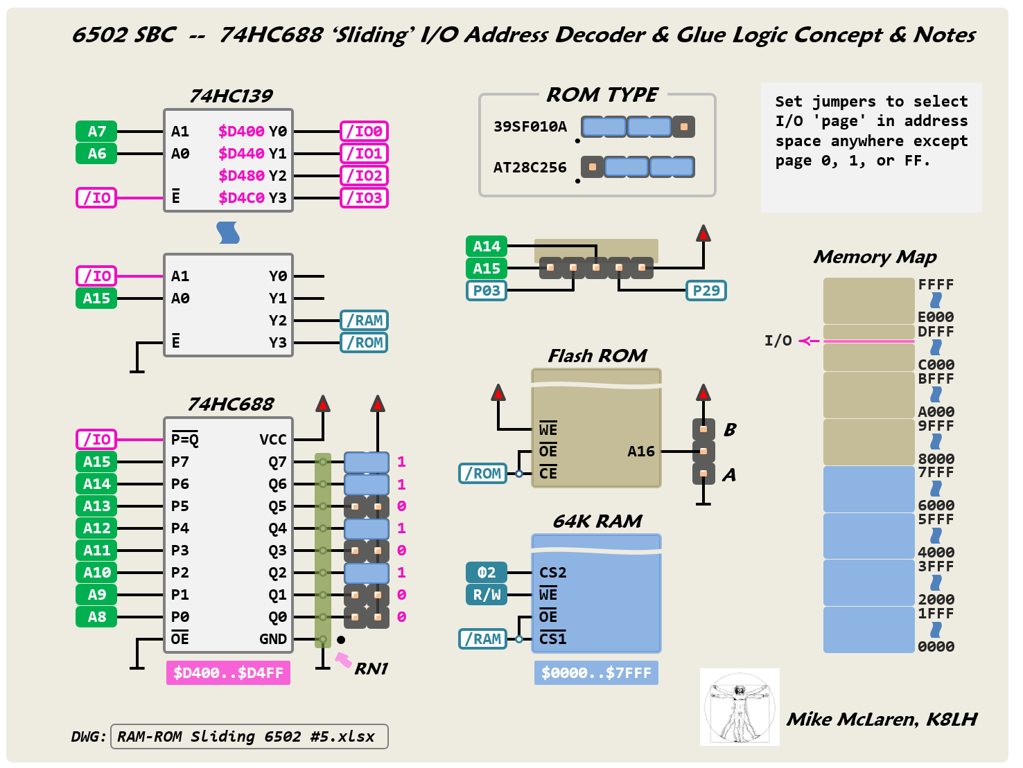 Attached is an example of how RAM/ROM and I/O can be controlled in a 65C02 system with three gates and a 3-of-8 decoder. The result is a maximum of 48K of RAM and 12 K of ROM, plus up to 8 I/O devices. This circuit has been tested at 20 MHz.