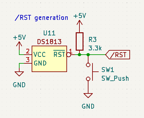 A sneaky benefit of gating /OE on Ø2 high is that the ROM will inject milder transients into the power supply circuit than it would if simultaneously selected and enabled. Also, the ROM will get off the data bus more quickly if /OE is enabled only when Ø2 is high. In this circuit, that is not a critical requirement. However, it may become so when you build your next design and decide to amp up the clock. - Add a 3.3K pullup resistor to your reset circuit. The DS1813’s internal pullup is weak and relying only on it to keep reset high may make your reset circuit noise-sensitive.