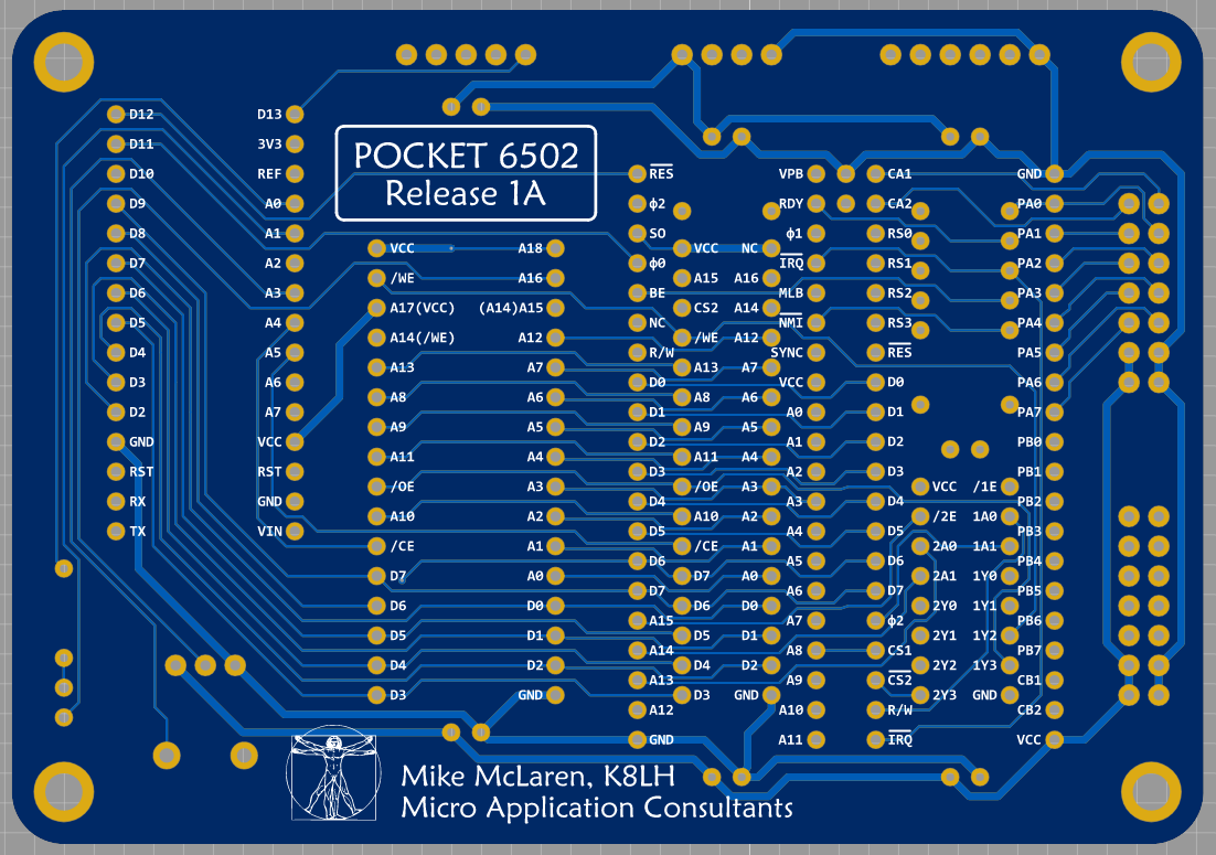 I am bumping this topic because I finally sat down and taught myself enough of KiCad to layout a schematic for my ideas. The project uses the W65C265QBX as the starting point, but I expanded the headers to two rows of forty pins (gaining access to every CPU pin). I also added RAM and ROM to the board to avoid the nuisance of wiring those with each project.
