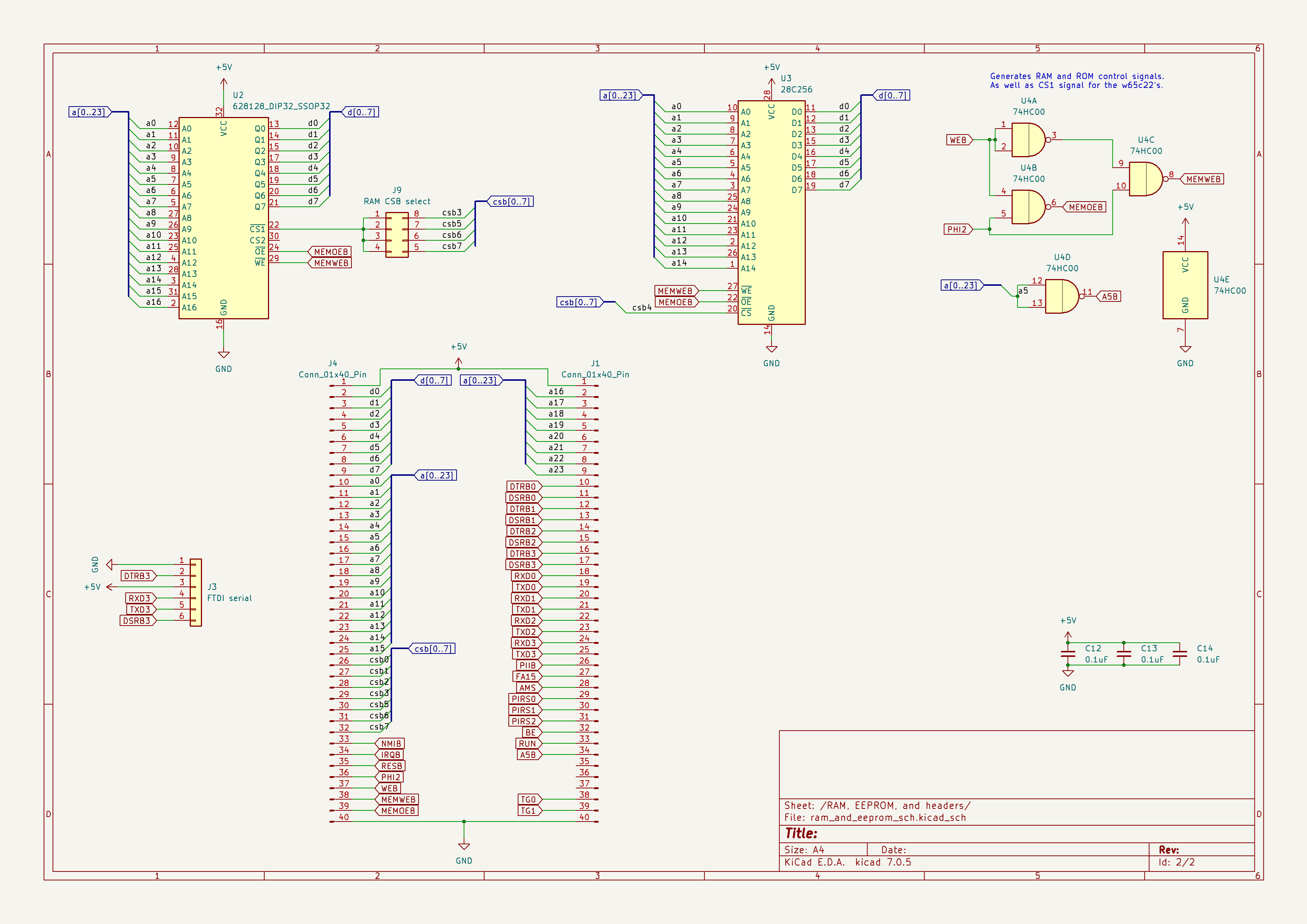 My idea is to create a breadboard friendly breakout board for the w65c265 to test how it works before design a PCB's with more features. This PCB allows access to the full address bus, chip select lines, and control signals. Attached are the two pages of my schematic. Also, the KiCad project on Github: https://github.com/Martin-H1/KiCad/tree ... 20Reloaded
