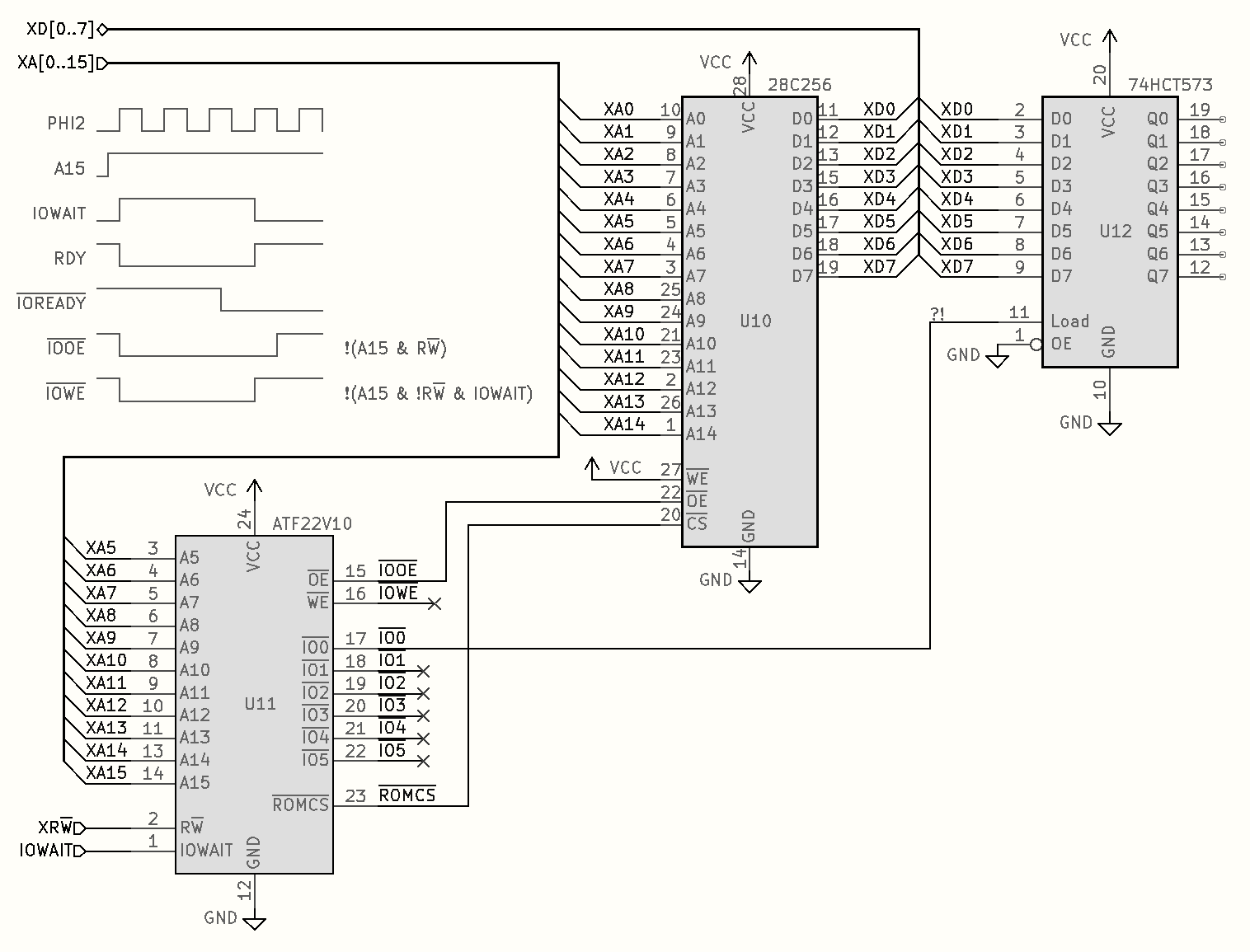 XA[0..15] and XD[0..7] are the buffered address and data lines; XRWB is a buffered copy of RWB; and IOWAIT is as in the earlier circuits, and also discussed in more detail below.