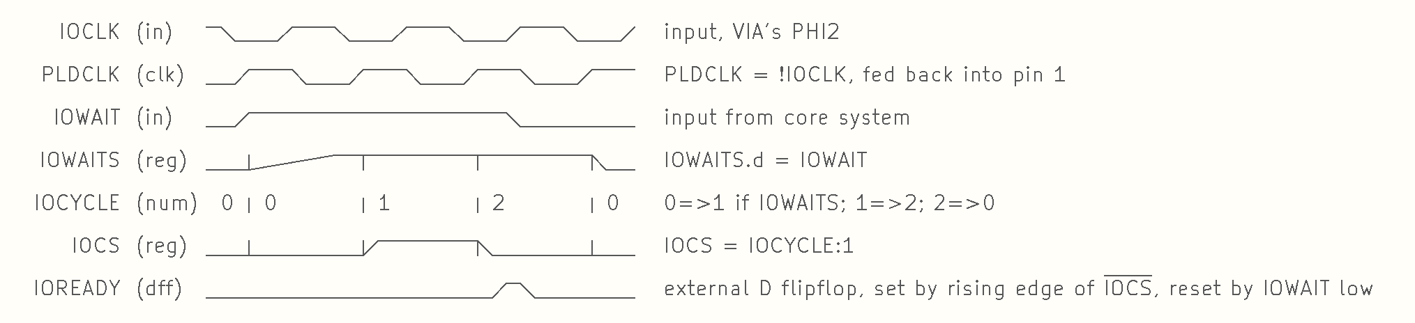 IOCYCLE is a counter that tracks progression through the operation. It transitions from 0 to 1 if IOWAITS is high; then from 1 to 2 to 0 again with the clock regardless of the state of IOWAITS.