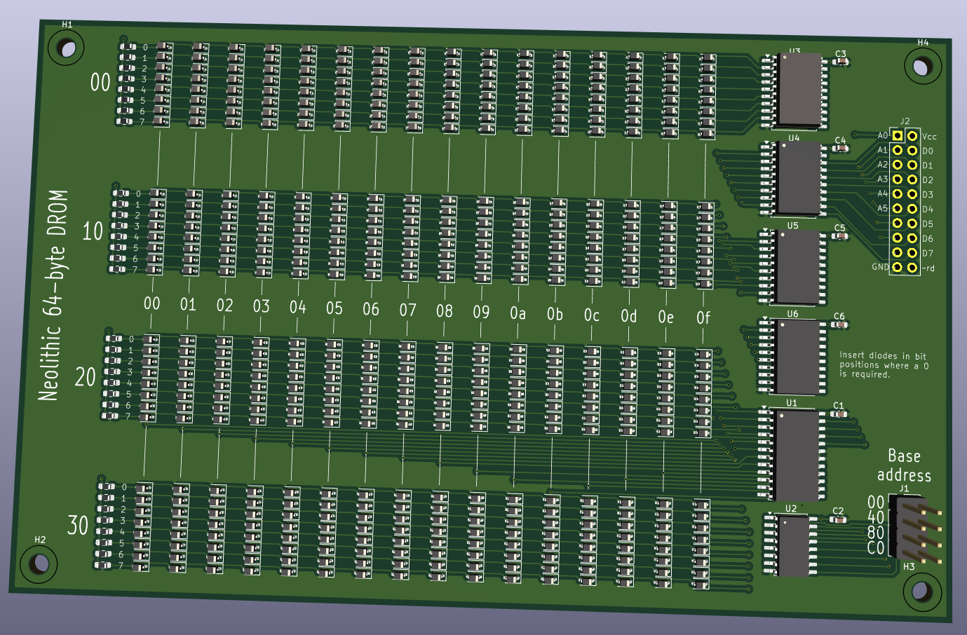 I think that 64 bytes is as many diodes as can be _conveniently_ placed on one side. Using both sides will definitely require a four layer board - effectively, it's two of these glued back to back, and I think that's getting a little silly :) If you want more boot, build up to four of these for :shock: 256 bytes! :shock: (which, incidentally, was the total memory of my first computer).