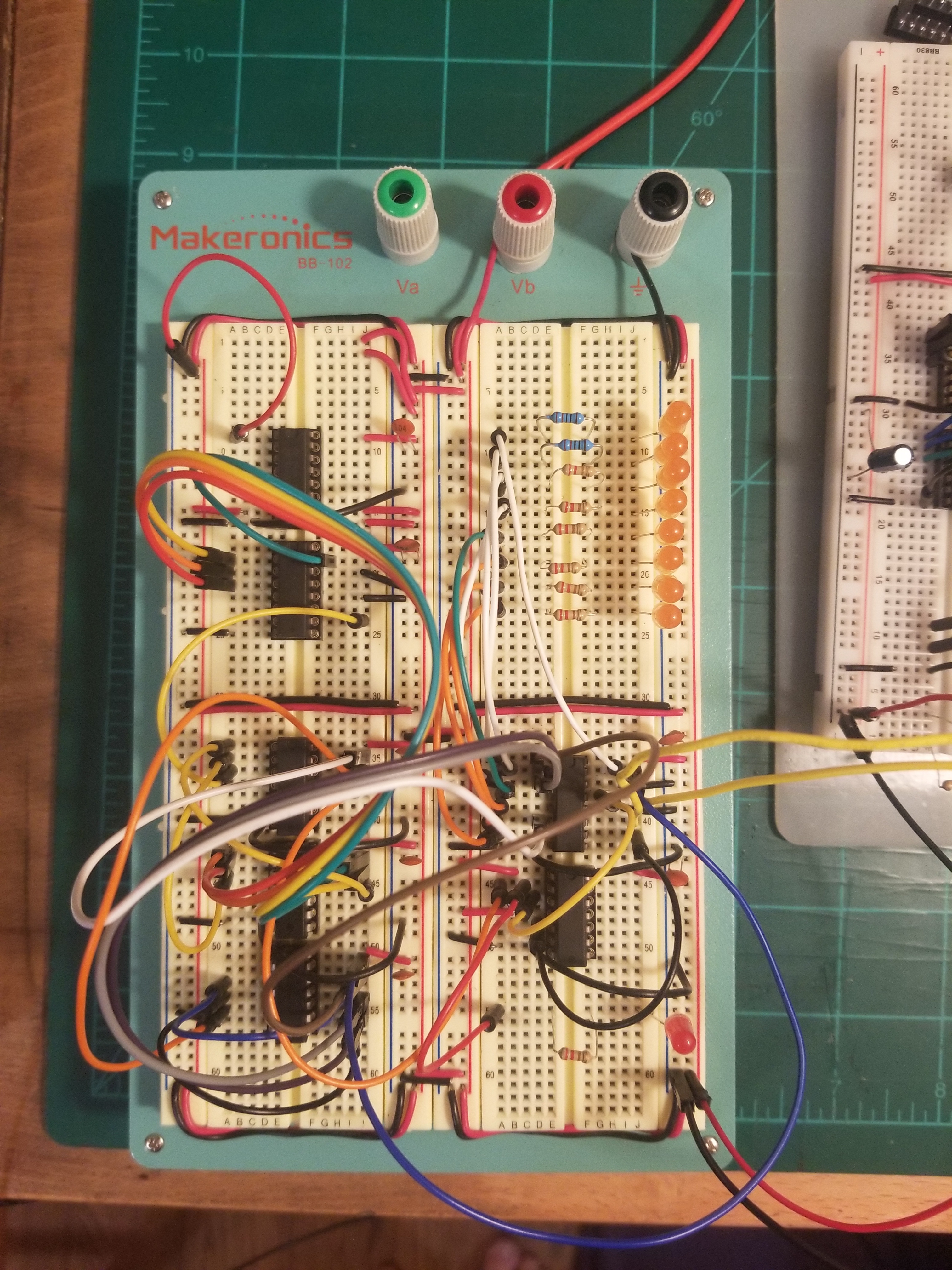 To get the row part of the RAM address I need to count from 0 - 29. That takes 5 bits, which is more than a '163 can do without cascading, but I have some more '590s. I used a few AND gates and a NAND gate to detect "29" and issue a reset signal. I set up some LEDs to test it, and it worked fine.