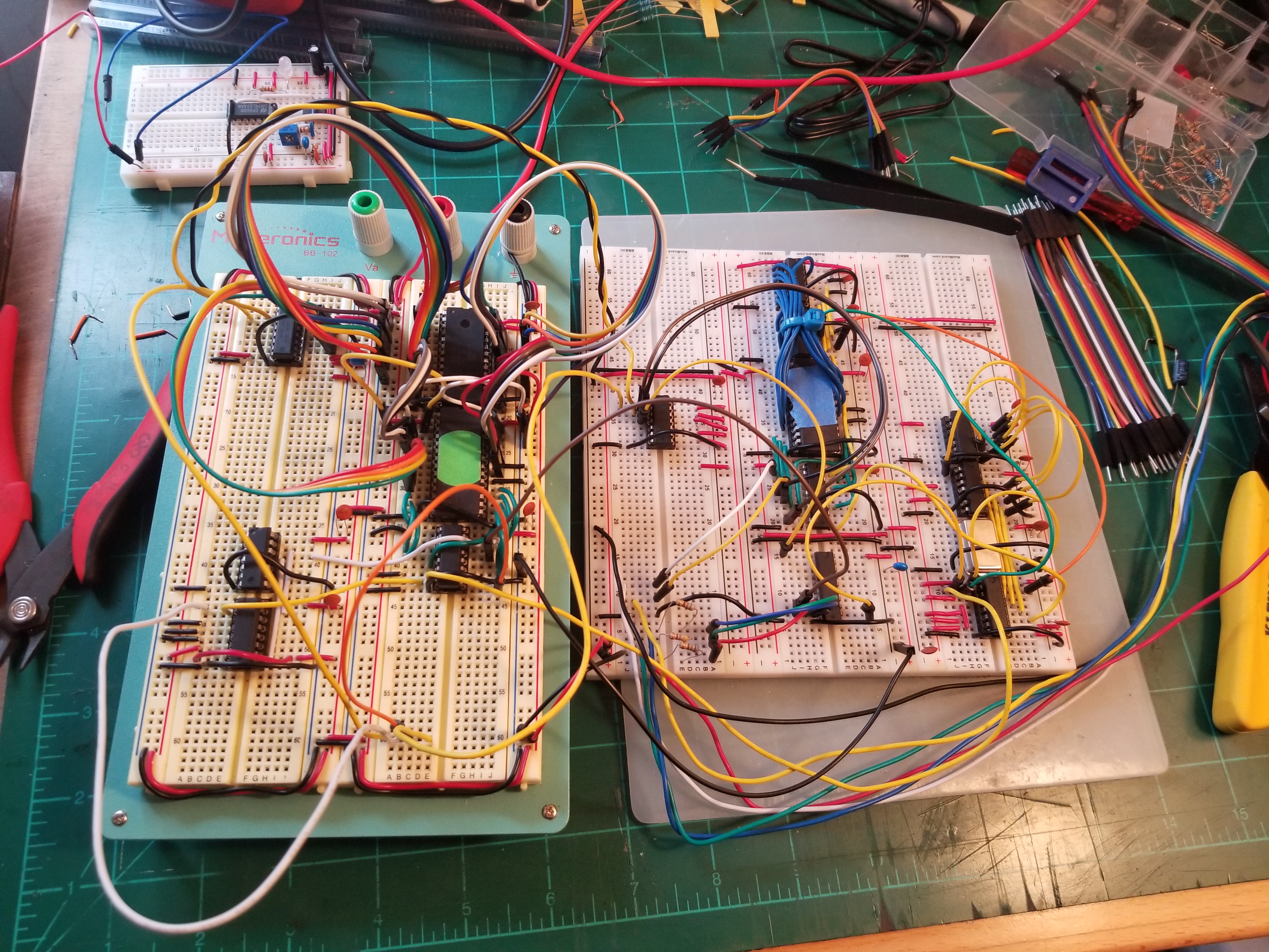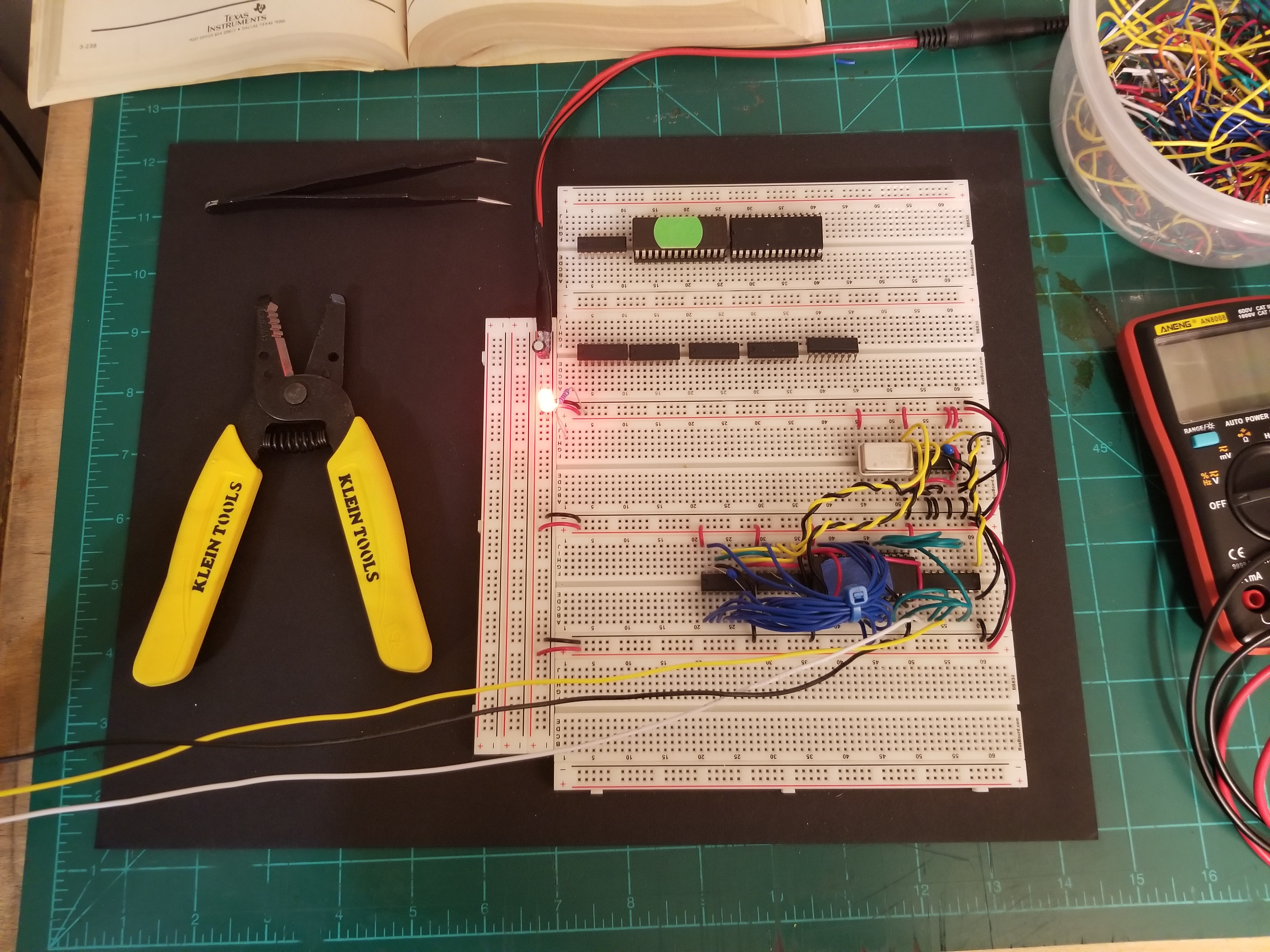 So I started building some timer circuits. The first one was easy; I need a 0 - 15 scan line counter to tell the character ROM which line of a 16-pixel tall character we're on. It will count 0 - 15 one time for each line of characters, 30 times for a whole frame. I can use a 74HC163. It, by nature, counts from 0 to 15 over and over again.