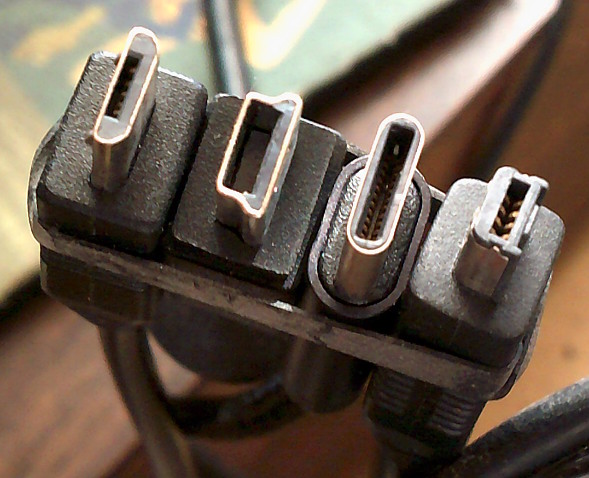 And if it weren't adequate, even the 6551 was specified to be able to do at least 115,000 bps if you don't use the internal baud-rate generator, and other UARTs will go faster. RS-422 can do 10Mbps at 40 feet, and RS-485 can do 35Mbps at 33 feet. Both can go at least 90kbps at 3/4 mile. USB can only go 16 feet. I understand that USB is much too complex for the technician to write his own drivers, he can't make up his own cables, can't really troubleshoot it, etc.. I don't know how they can call it "universal" (in "universal serial bus") if there are nine kinds of connectors and male and female of each, or call it a bus if normally one connector only goes to one device. Edit, 10/17/18: I was looking for a USB cord for something and I picked up cords with four of the smallest USB connectors I happened to have on my desk and rubber-banded them together for a picture. Actually, none of these fit the USB connector on my Samsung Sprint phone. That one is yet another size, just a hair wider than the widest one here: