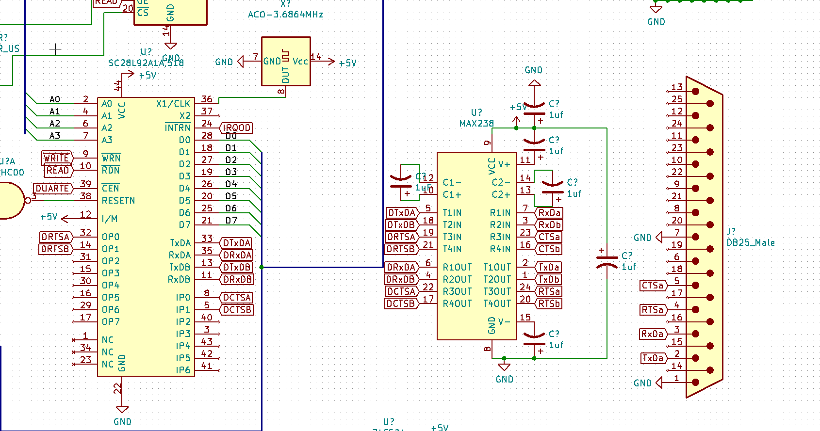 I do have a UART on board (the 28L92 DUART) and it's wired up to a MAX238 that's then wired to a DSUB-25 connector for RS-232. (it seems to handle 2 RS-232 connections, but I'm not presently using the second one, so I could unwire it and use the second channel of the DUART for something else) Here's a picture: