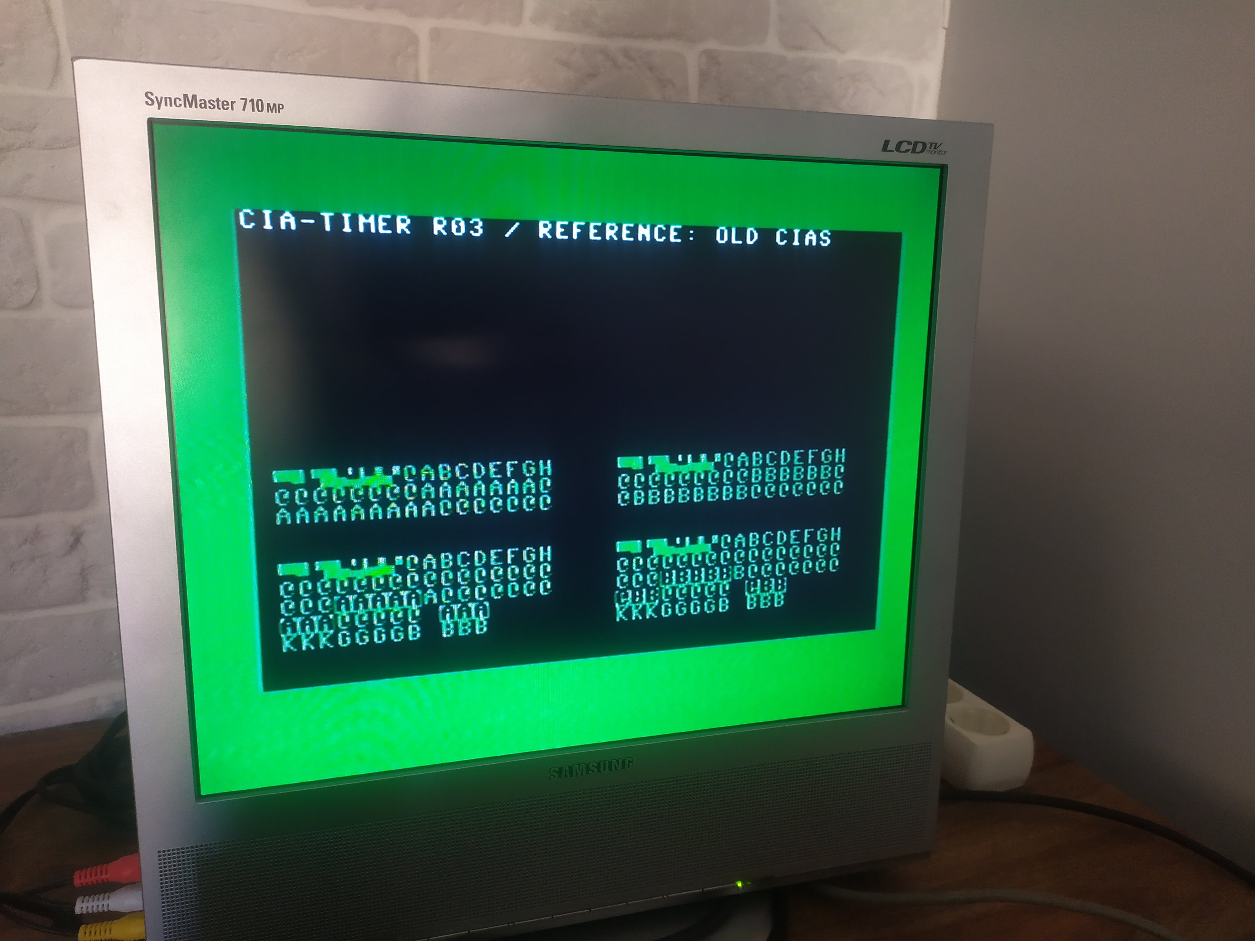The left side tests are for TIMERA, right side for TIMERB. Also, in the two upper tests IRQ are disabled, and enabled on the lower. Within the interrupt handler, ICR and TIMER are sampled and outputted into the screen.