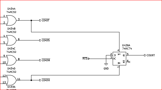 The idea was... when /RES goes high, that became a clock pulse for the flipflop that generates COUNT. With its Data pin tied to GND... on reset, COUNT should be 0. Right? Nope. Wrong. As I'm forcing a write to all registers on reset, /LOADT and /LOADH are active, so both /SET and /RESET inputs to the DFF are asserted simultaneously. When the /RES, /LOADT and /LOADH finally goes high, COUNT is always 1.