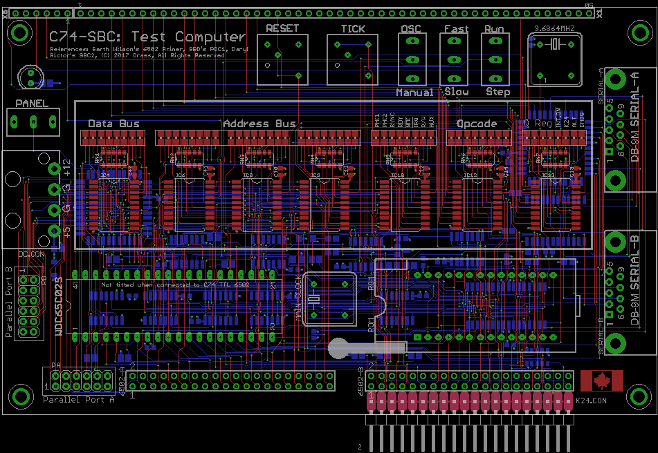 BDD's POC1 as references here, so the design will look very familiar. The SBC uses a simple variation of Garth's address decoder, an NXP SCC2692 UART per BDD's recommendation, and a WDC65C22 VIA for a nice complement of interrupt sources for testing. I used a 128K RAM chip so the K24 extended address bus can be exercised, and also put the ROM on a ZIF socket to make it easy to re-program. I included a socketed WDC65C02 on the board to let me verify the SBC itself. I can then remove the MPU from it's socket and stack the card on the TLL CPU for testing. Incidentally, I added a wait-state when the SBC accesses peripherals (only when using the FAST clock) so that I can try to run the TTL CPU flat-out and see what happens