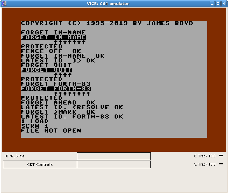 The downside is that the keyboard buffer would sometimes spill over into adjacent memory. It affected the pointer for bottom of memory for the C64 kernal. This isn't really a problem since that pointer isn't used in Forth. The top of memory pointer for the C64 kernal is just above the pointer for the bottom of memory and the one which concerned me. The C64 top of memory pointer normally points to the first address past the usable RAM. If a file is opened on device 2 on the C64, it will be for RS-232 and the C64 will create two 256 byte buffers which end at the top of memory. Fleet Forth's CONFIGURE sets the top of memory pointer to point to the start of the block buffer table so if these two buffers are created, they will not overwrite part of the topmost block buffer. If a keyboard buffer overflow occurs due to XED stuffing three right shift characters into the keyboard buffer and the top of memory pointer is altered, opening a file on device 2 could corrupt the block buffer table or some blocks. There is an address the C64 uses to determine the size of the keyboard buffer, which is used by the ISR to keep from placing too many characters in the buffer. The version of VICE I'm using seems to ignore that value and uses the default size of ten.