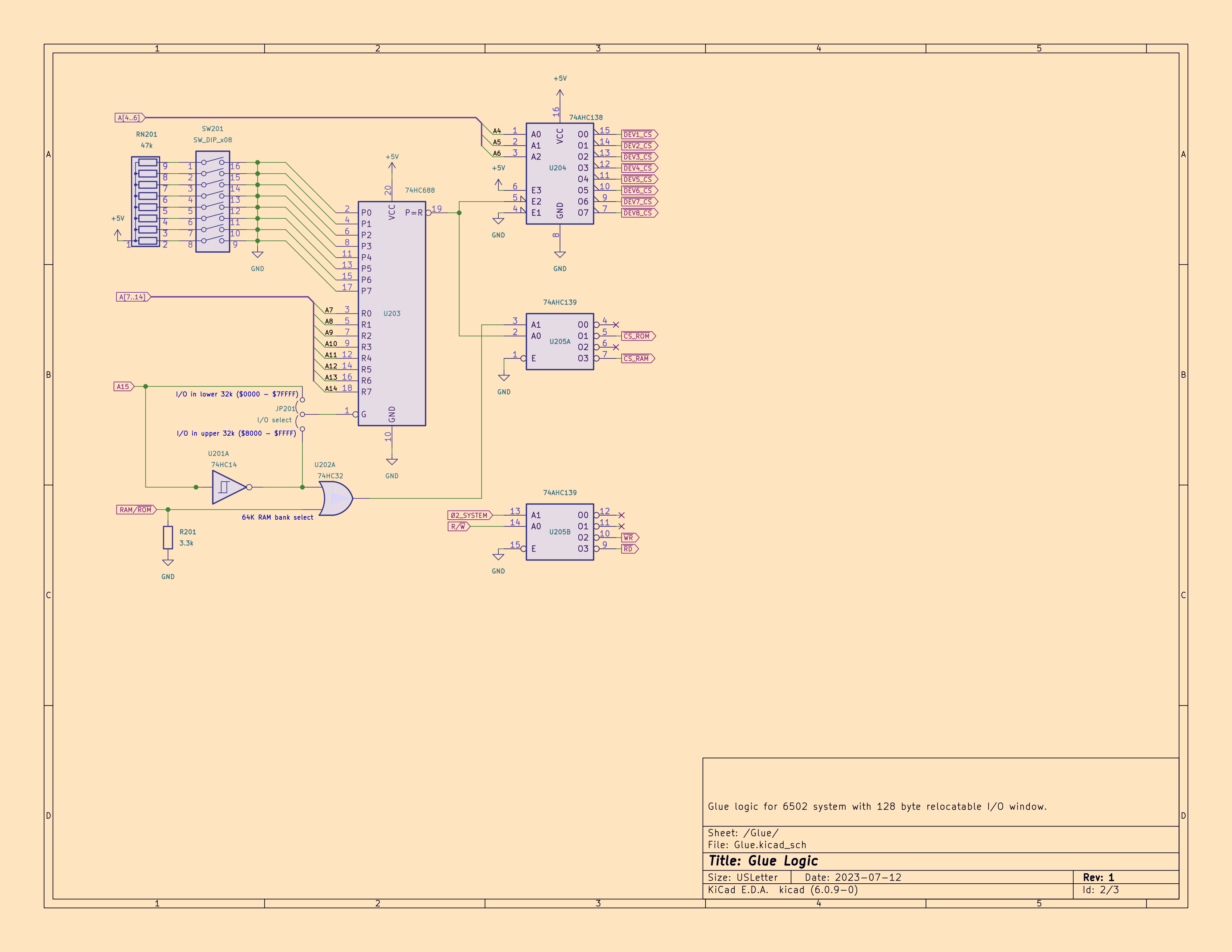 You can see I created the same data bus, then broke out its individual lines. I also broke out individual address lines to connect them to the VIAs' register select lines. Again, no problems. On that same page I also broke out D0 to create an output "register" to control RAM/ROM banking: