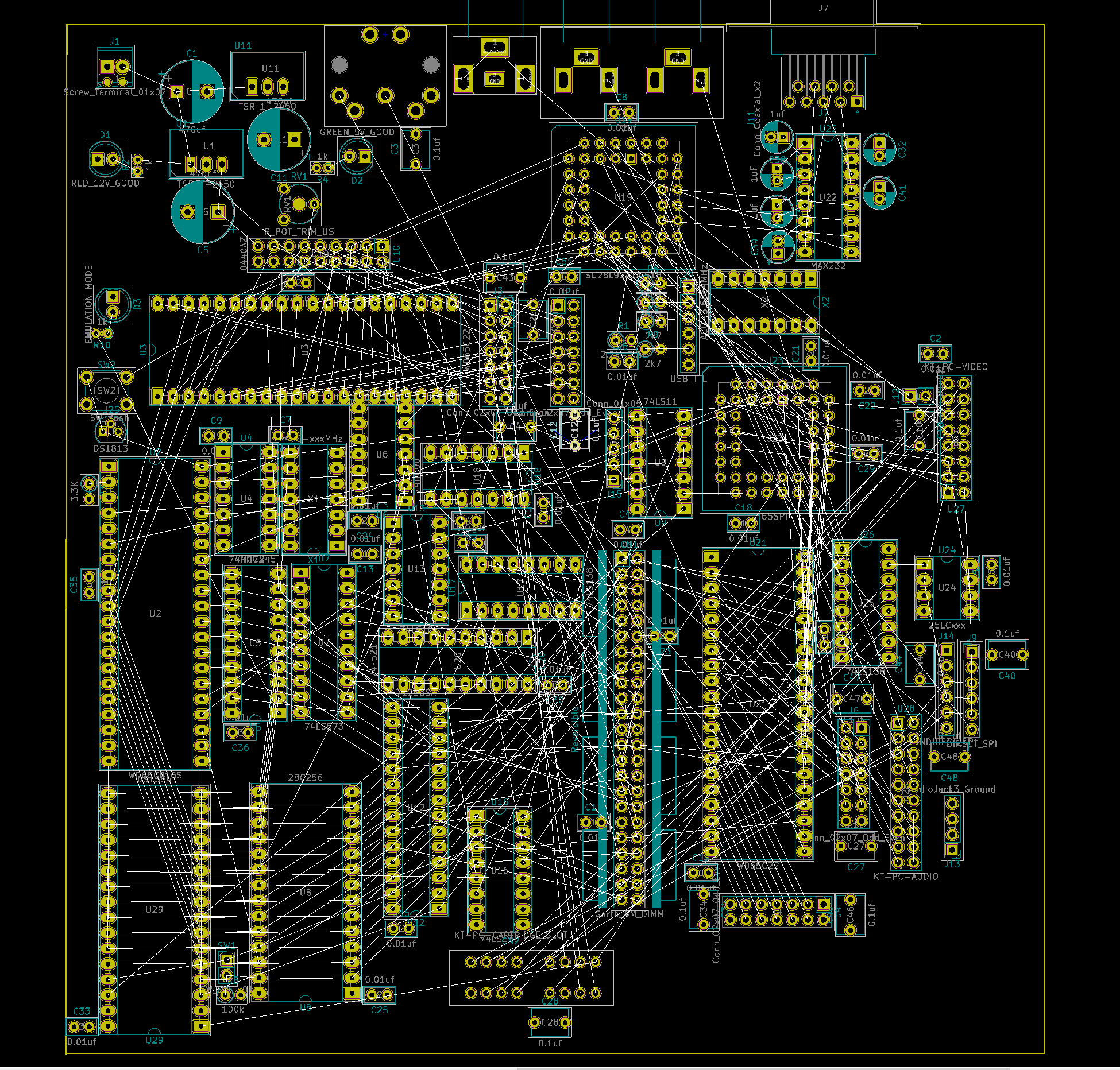 So, I've got all the ports lined up on the "back" of the board, but I may take some of the expansion card slots/headers and line them up too, the issue is, I have 2 VIAs, one controls most of the important stuff, audio, video, text display, the other isn't hooked up to a whole lot (2 expansion headers, and I think possibly the cartridge connector). lining them all up would mix these signals, and probably make it harder to route. I'm messing with the layout right now though, and I think it's going pretty well so far. Although I do have the 816 pressed up against the left side of the board, and all of its busses going to the right and downward. I've done this because I think it will be easier to route this way, but it may bite me.