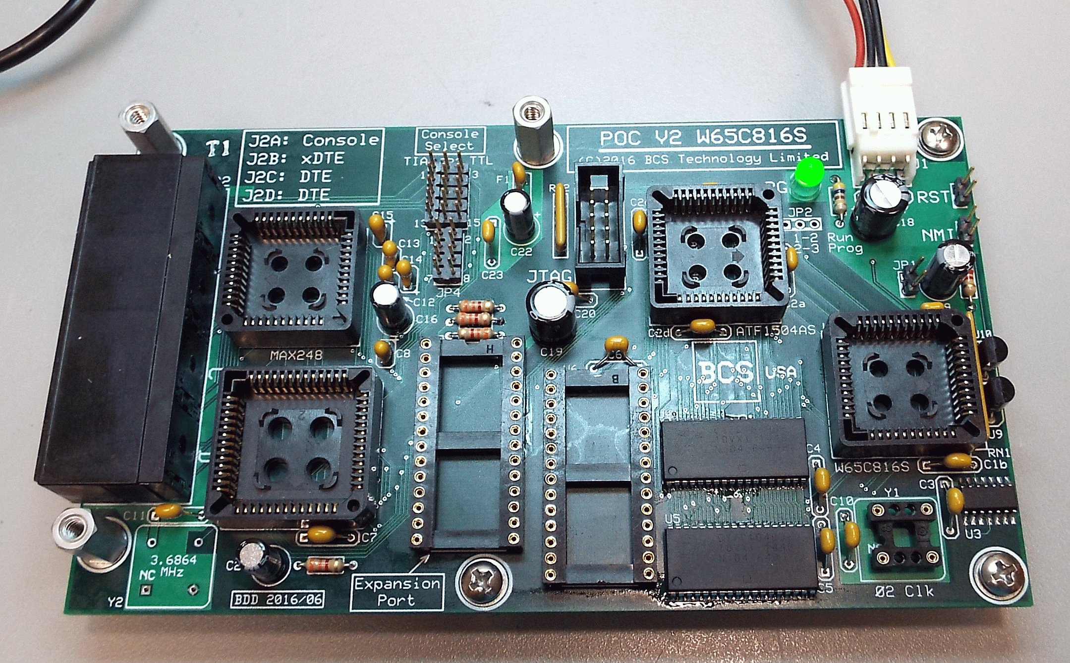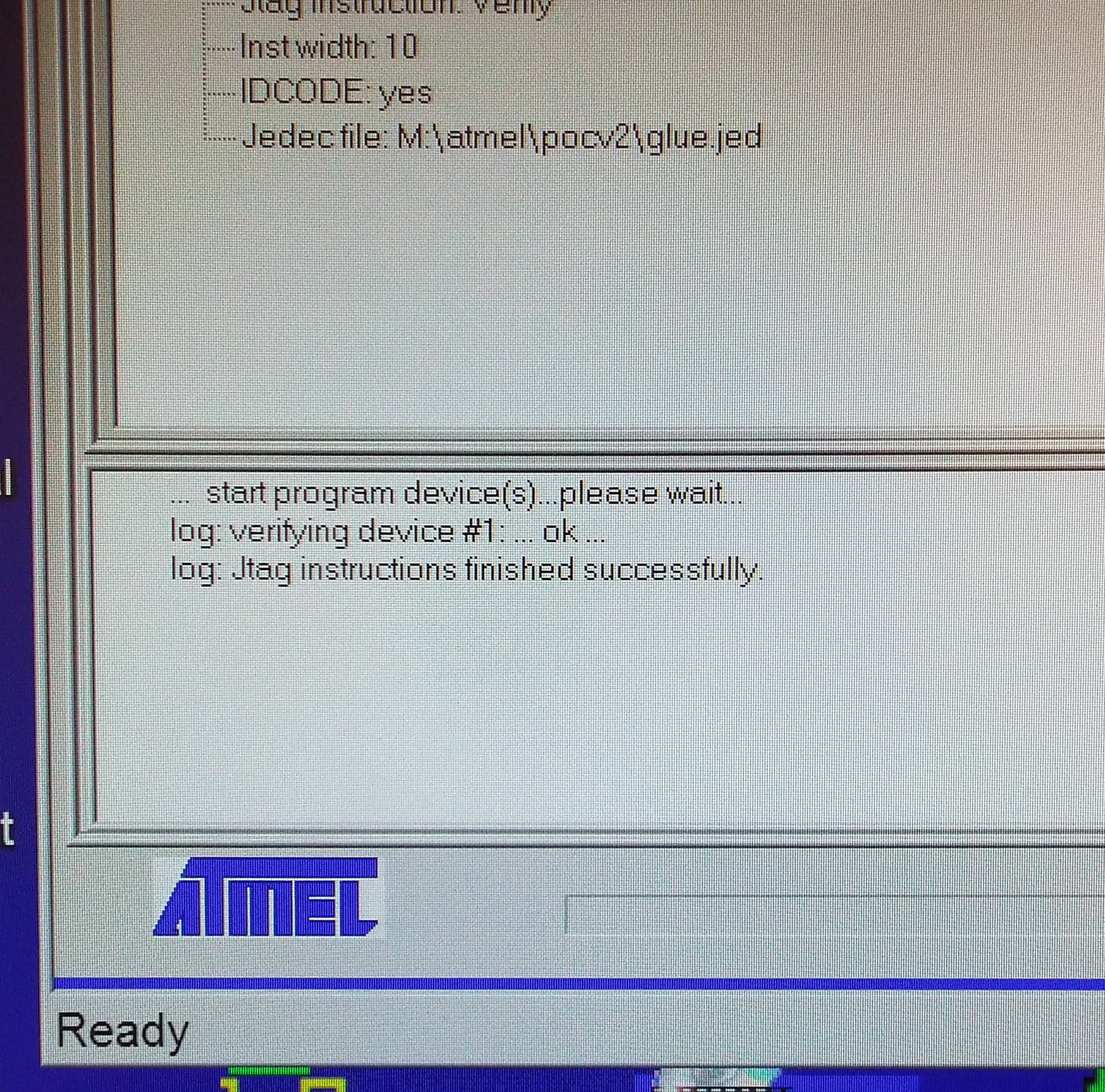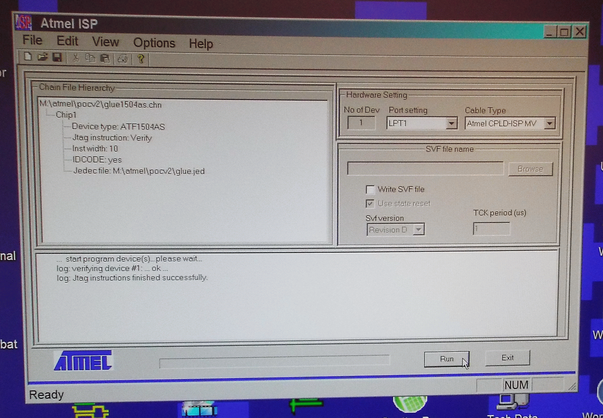 The next step in getting POC V2 up and running was to see if the JTAG port worked. The plan was to program a CPLD (Atmel ATF1504AS) in the Atmel test rig, install it in POC V2 and do a verify on it. If the verify operation succeeded then that meant the Atmel ISP software was able to read the CPLD while installed in POC V2, proving that the JTAG port was working.
