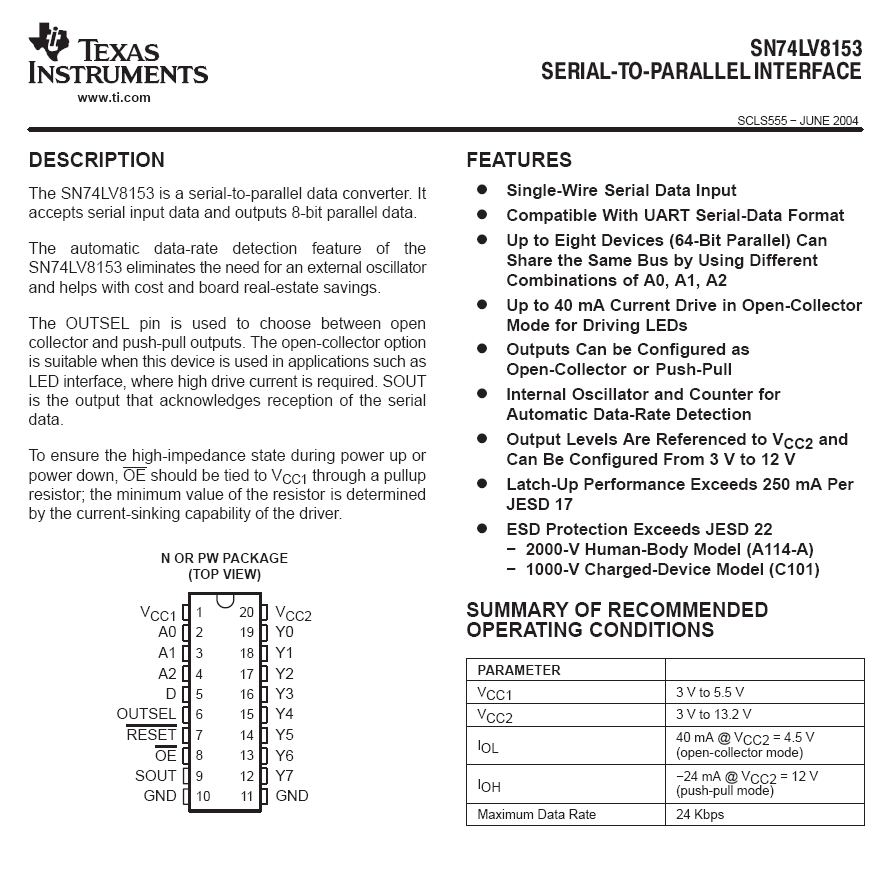 Also: there's a somewhat obscure point regarding the SOUT pin (which in many scenarios will go unused). Although the 8 data outputs clearly get tri-stated when the /OE input is false, it's unclear whether the SOUT pin is also affected. Thanks go to barnacle for reporting that SOUT is active at all times, regardless of /OE.
