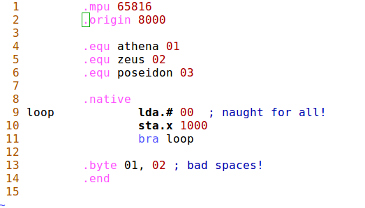 adding a conversion tool to generate other formats, at least semi-automatically. The first target obviously will be the official WDC syntax from the Manual, and probably As65. This should be pretty straightforward (he said, tempting the gods of coding), and will make it easier for people to use stuff written in Tinkasm.