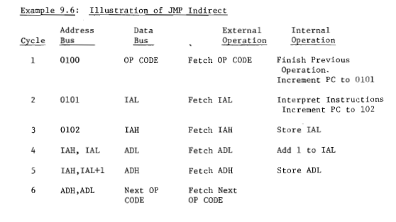- "In the JMP Indirect instruction, the second and third bytes of the instruction represent the indirect low and high bytes respectively of the memory location containing ADL. Once ADL is fetched, the program counter is incremented with the next location containing ADH."