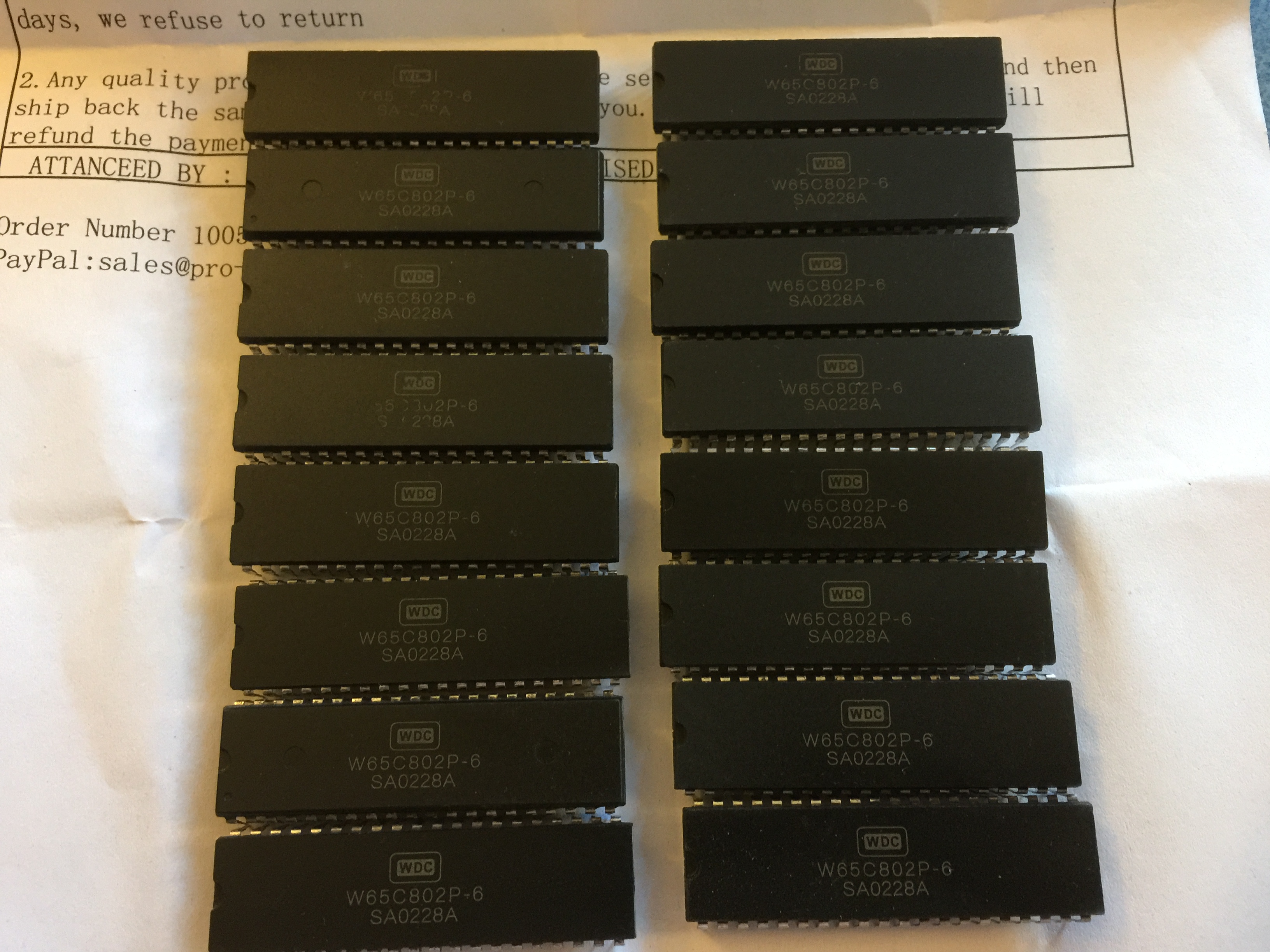 These arrived today. 16 WDC 65C802s. I'll test them out on my three chip board when I've sorted out the new firmware.