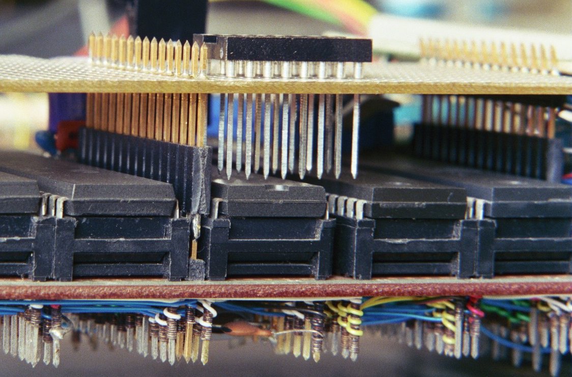You can also get dual-row ones which are good for plugging IDCs onto. This picture shows a couple with red insulators (after the same mezzanine had some circuitry built onto it:
