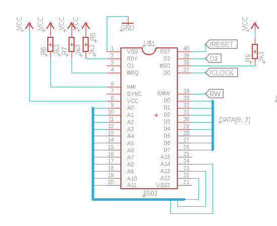 Finally I turn on the 6502 clock, reset and VCC. For the RDY, IRQ, NMI and SO pins I connected directly to the VCC with 3k3 resistor.