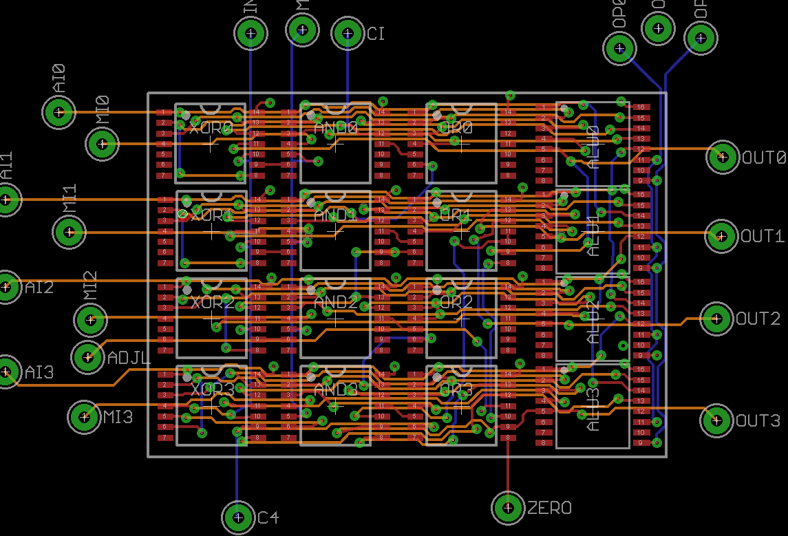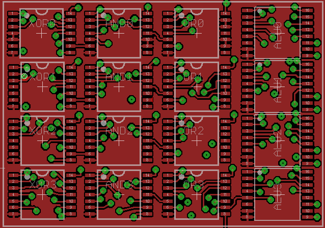 Here is the ALU nibble completely routed (still needs to be cleaned up a bit). The surrounding white box is 32x24 mm. A full ALU should be twice that, so 32x48 mm, which is about 10% of a Eurocard. The green circles are test points. They just serve as place holders for all external connections (input, output and control signals). Inputs are all on the left, outputs on the right, and controls run vertically. The bottom two signals (partial Carry and Zero flag) should propagate to upper nibble.