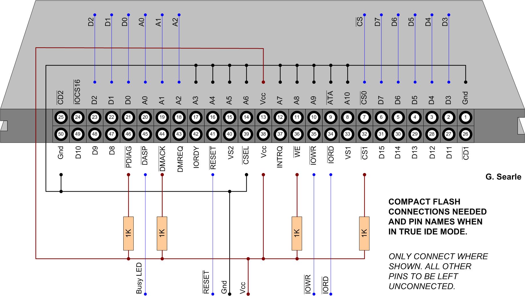 One last bit of interest is the pin lengths of the CF socket. Note that both ground and Vcc pins are longer than the others. This means that Pins 13 and 38 are Vcc and always in the center of the connector, regardless of whether your have a normal or inverse socket. The ground pins (1 and 50) are also longer pins, and can be used to determine if your socket is inverse or normal, as they swap top to bottom. Pins 25 and 26 are CD1/2 and simply grounded within the CF card, which can be used as an indicator that the card is fully inserted... these swap with the ground pins for an inverse socket.