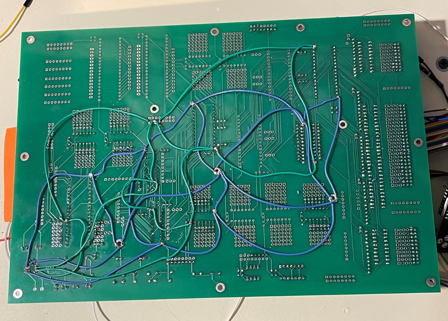 To reduce the number of variables, I removed the RAM and GAL. I am decoding for the ROM enable with A15#. I have changed back to the HC family of ICs for the '573, '245, and '00. I have also added bodge wire to the back of the PCB for all VCC and GND connections for the ICs being used as part of the core 65816.